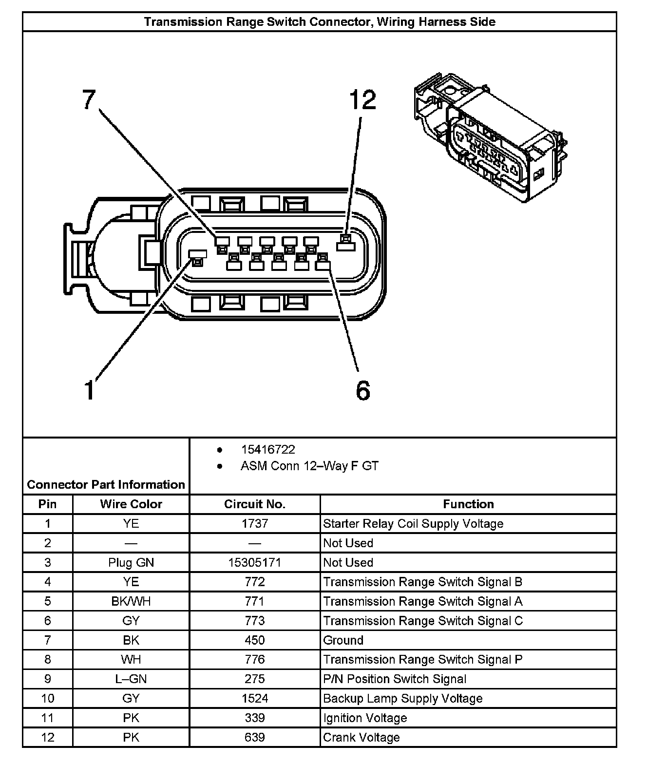 Transmission Range Switch Connector, Wiring Harness Side: