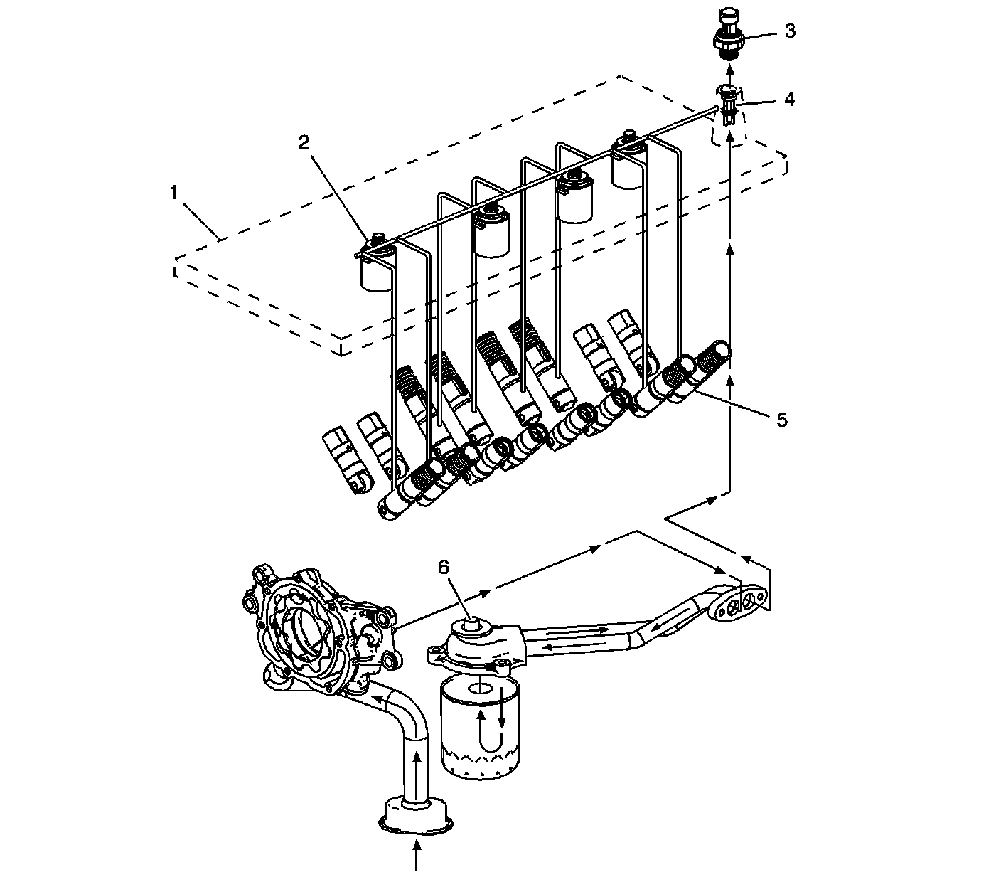 When the DoD system is commanded ON, the ECM will direct the solenoids of the oil manifold to open and direct pressurized oil to the valve lifters. Oil travels through the VLOM and engine block oil galleries and enters the inlet port (6) of the valve lifter.