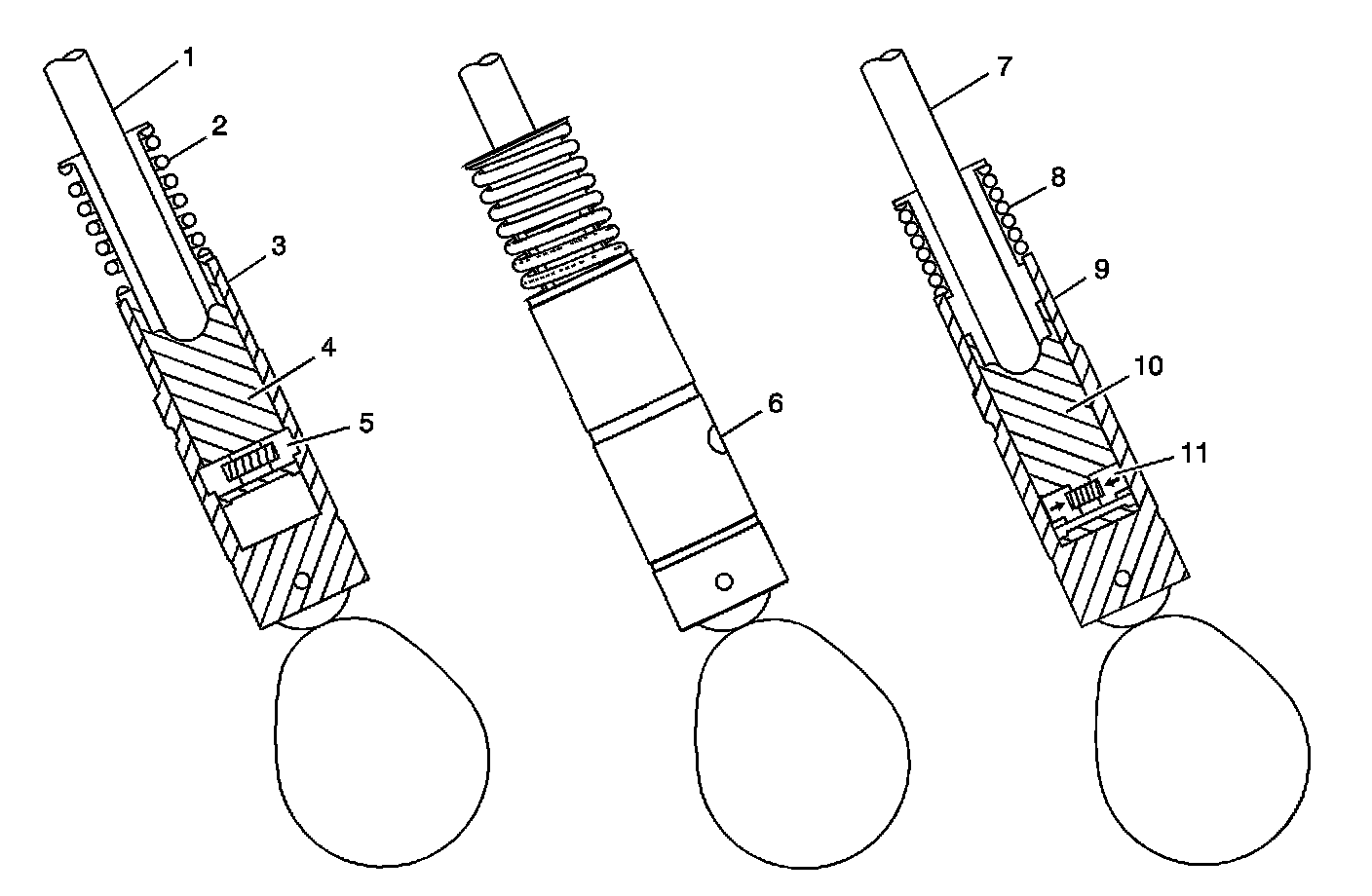 When operating in V8 mode, the DoD valve lifters function similar to the non-DoD valve lifters. The DoD oil manifold solenoids are in the closed position, with no pressurized oil directed to the valve lifters. The pushrod (1) travels upward and downward to actuate the rocker arm and valve. The spring loaded locking pins (5) of the lifter are extended outward and mechanically lock the pin housing (4) to the outer body of the valve lifter (3).