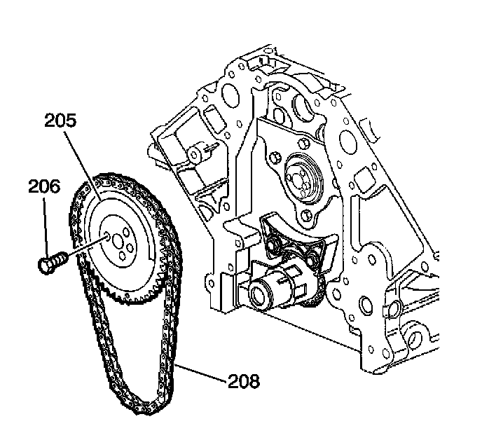 Install the camshaft sprocket (205) and timing chain (208). If necessary, rotate the camshaft or crankshaft sprockets in order to align the timing marks.