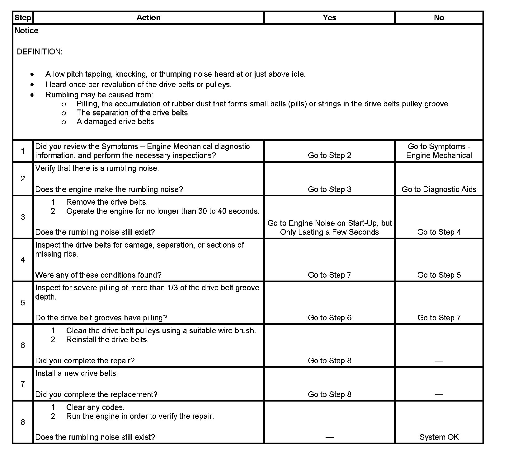 If after replacing the drive belts and completing the diagnostic table, the rumbling is only heard with the drive belts installed, there might be an accessory drive component failure. Varying the load on the accessory drive components may aid in identifying which component is causing the rumbling noise.
