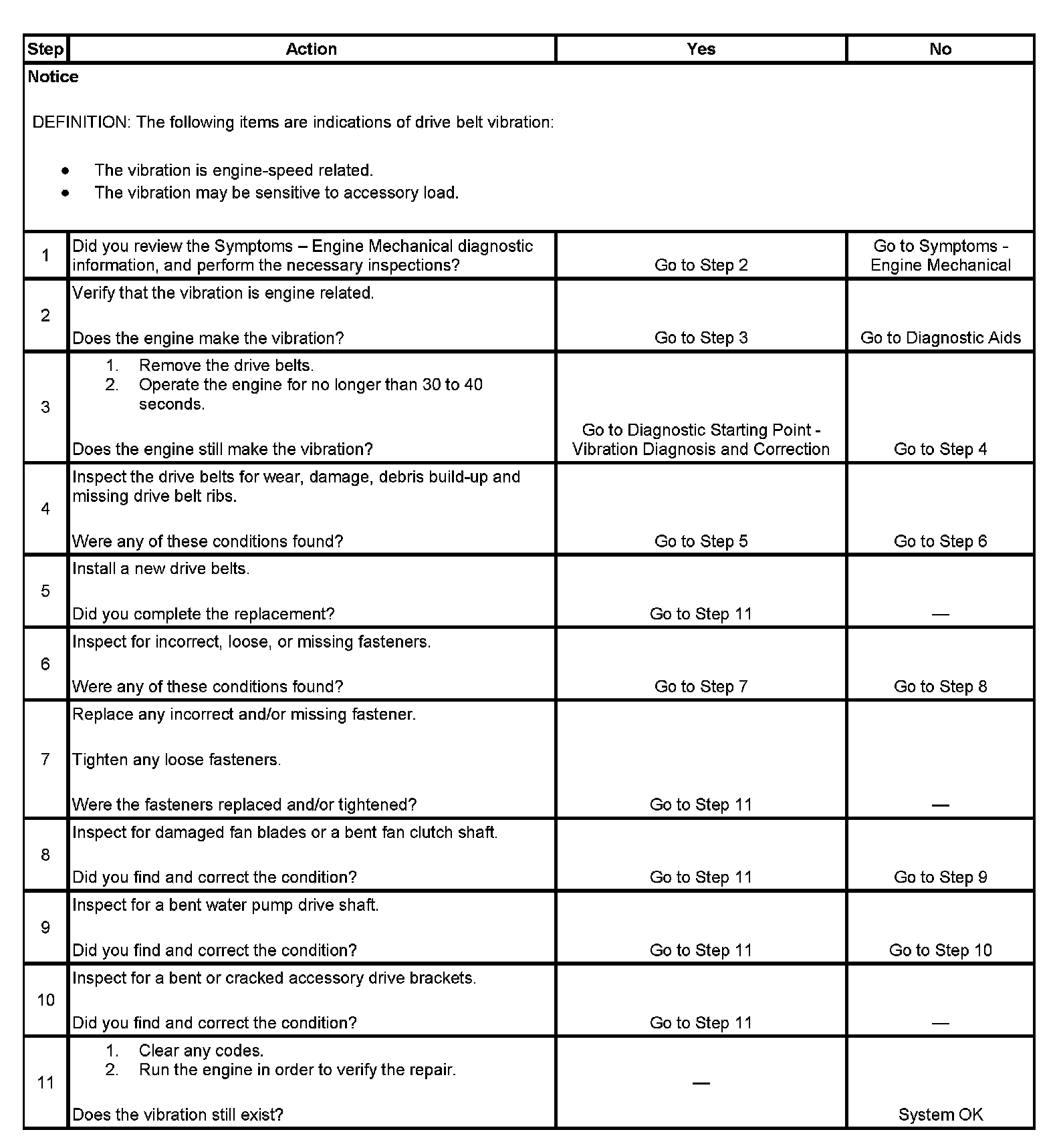 3. This test is to verify that the drive belts or accessory drive components may be causing the vibration. Remove the drive belts and operate the engine for a few seconds, this will verify if the vibration is related to the drive belts or not. With the drive belts removed the water pump will not operate and the engine may overheat. Also diagnostic trouble codes (DTCs) may set when the engine is operated with the drive belts removed.