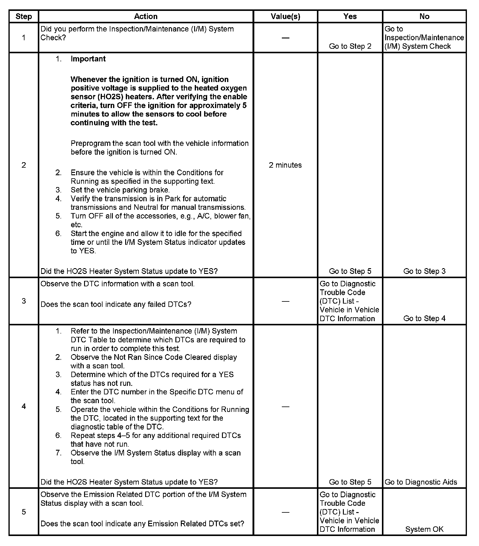 The purpose of this test is to satisfy the enable criteria necessary to execute inspection/maintenance (I/M) readiness diagnostics for the heated oxygen sensor (HO2S) system. The test may be used to set the I/M System Status to YES. The I/M System Status display on the scan tool provides an indication of whether the control module has completed the required tests. The I/M System Status does not indicate that the tests have passed or failed. When all of the diagnostics for a specific system have run and passed, the I/M System Status will update to YES. If a test for a specific system has failed, the I/M System Status will update to YES, indicating a determination was made, even if all of the other tests for that system have not run.
