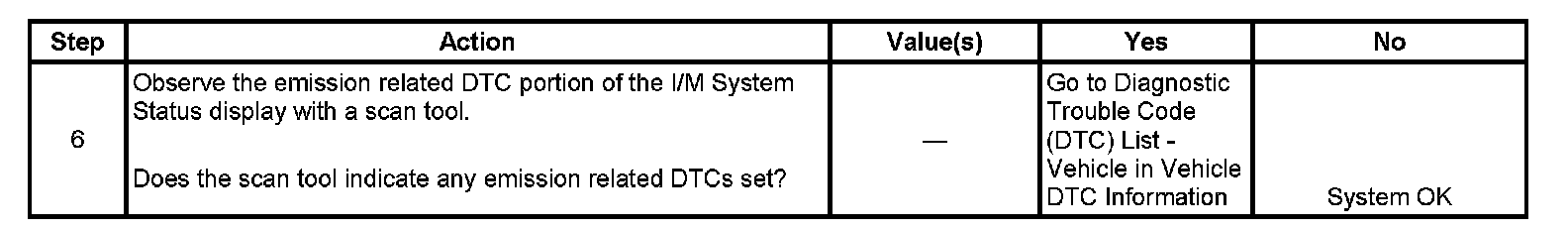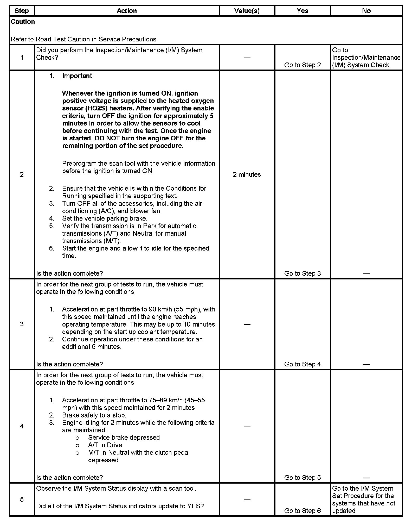 The scan tool can be used in order to monitor each of the I/M System Status indicators during the I/M Complete System Set Procedure. When all of the indicators for a test step have updated to YES, testing can move on to the next step even if the remaining portion of the test is not complete. For example, step 3 is designed to run the EVAP, secondary air injection (AIR), and HO2S tests. The procedure instructs the technician to operate the vehicle in the enable conditions for 6 minutes. If all 3 tests have updated to YES within 4 minutes, you do not need to continue with the enable conditions and testing can advance to the next step.