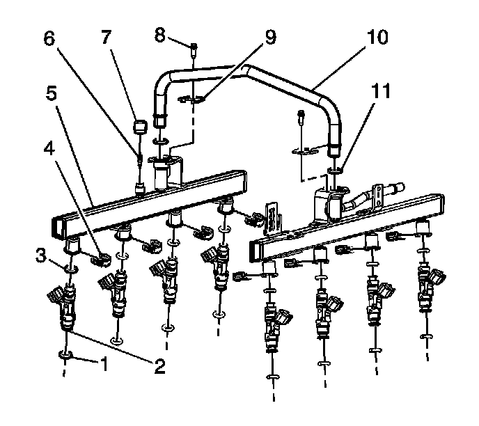4. Remove and discard the fuel rail crossover pipe O-rings (11).