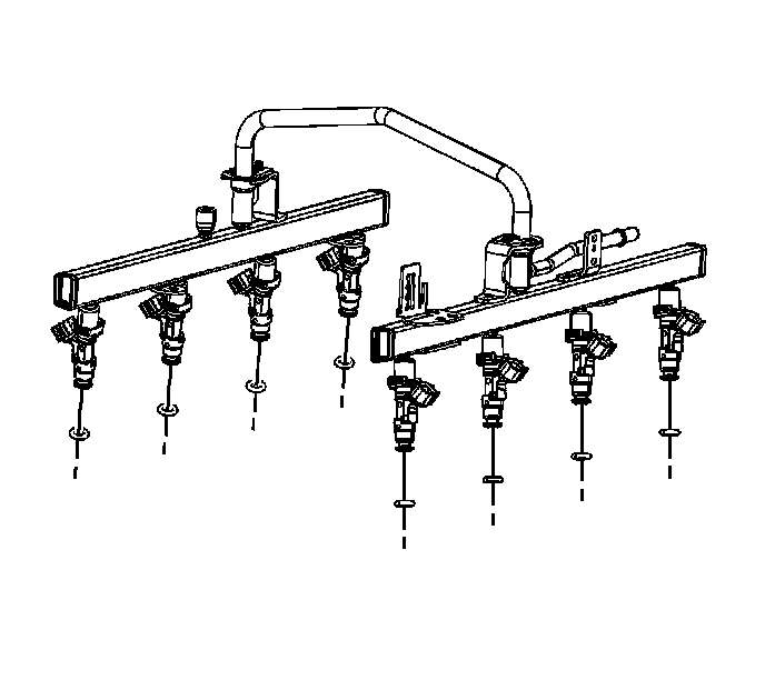 - Remove the fuel rail assembly carefully in order to prevent damage to the injector electrical connector terminals and the injector spray tips. Support the fuel rail after the fuel rail is removed in order to avoid damaging the fuel rail components.