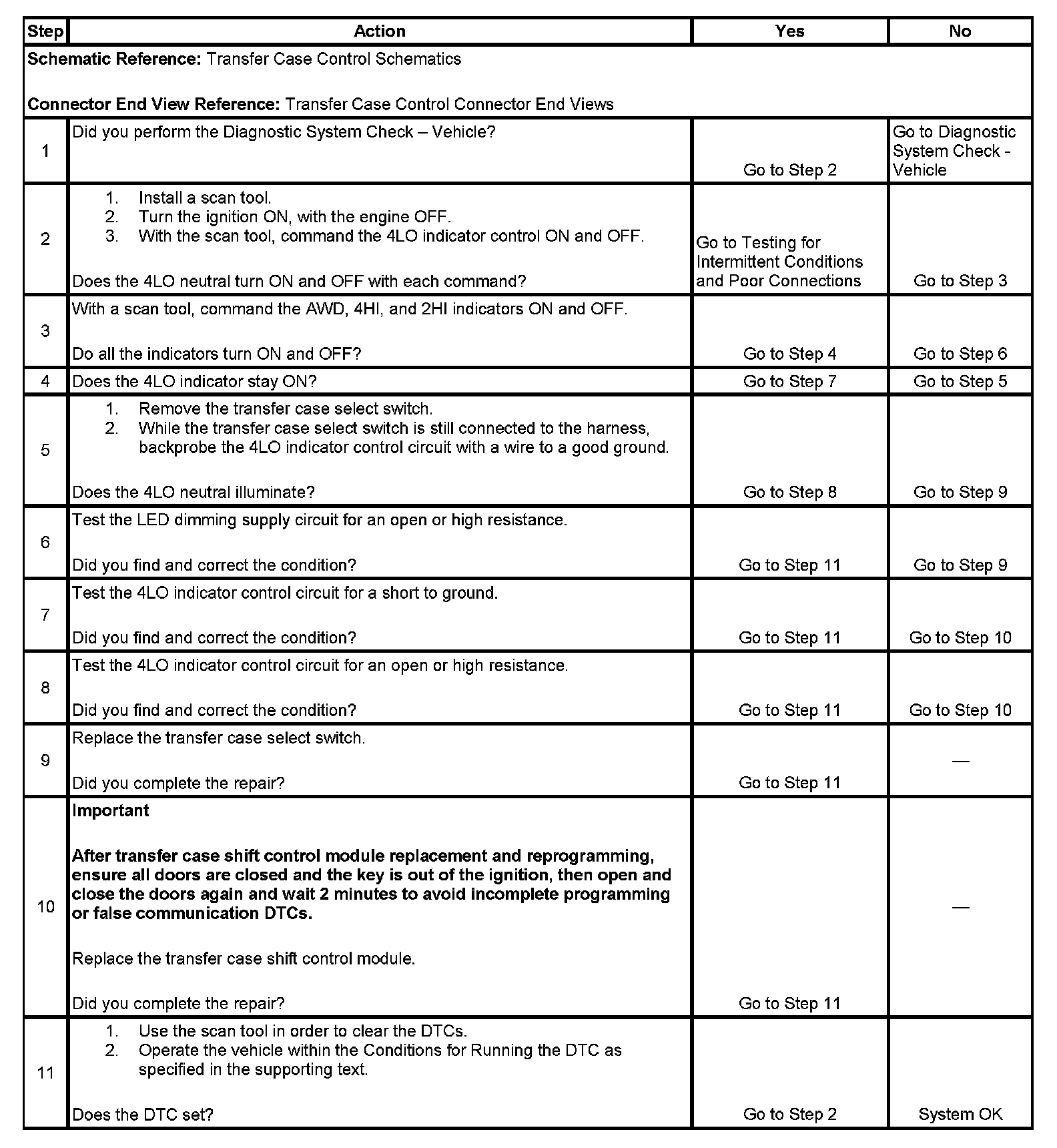 ^ If the system detects a voltage of 3 volts or less for 1.5 seconds when the 4LO indicator is not commanded, the DTC is logged.
