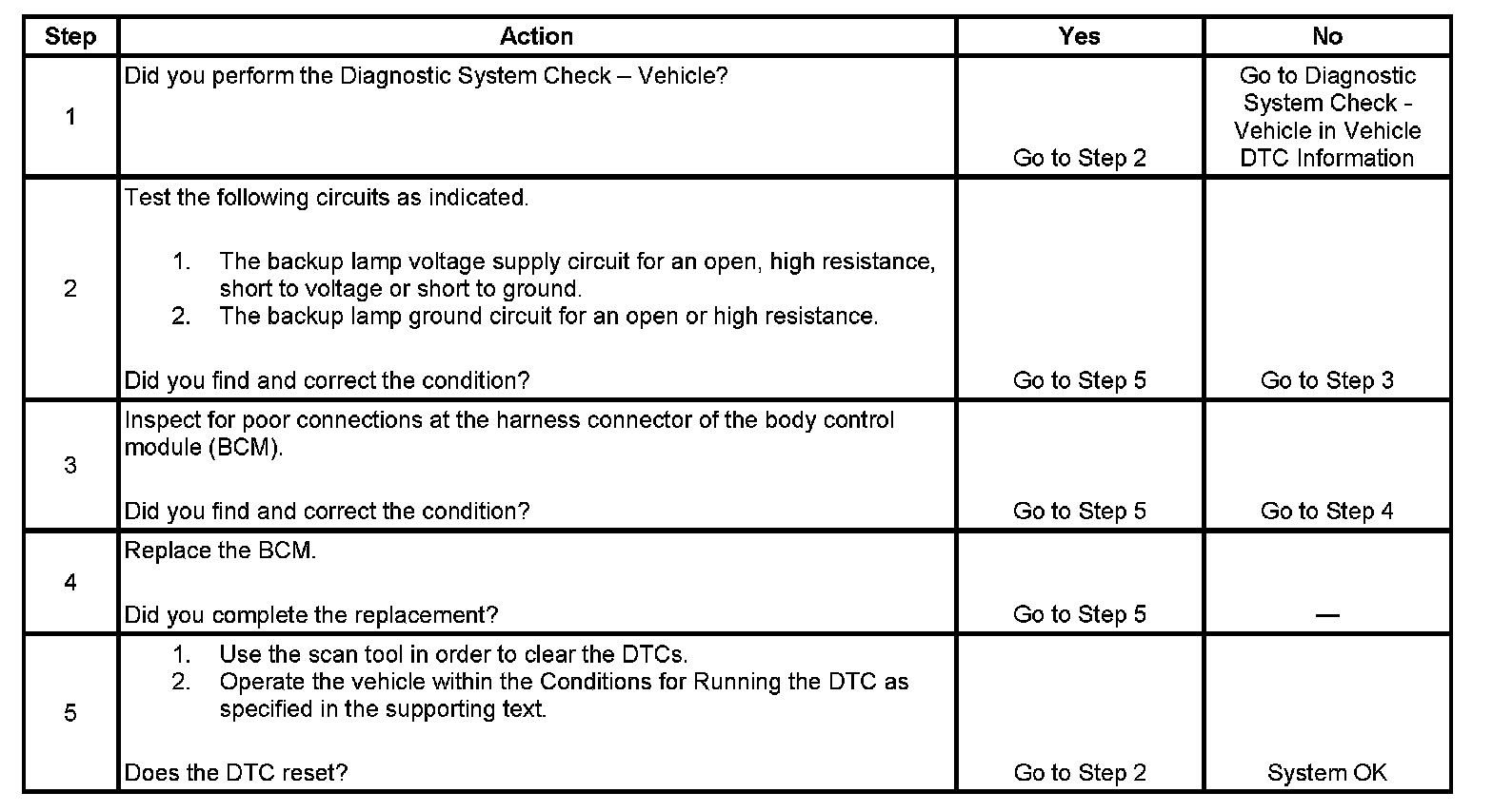 - When the BCM is not receiving a backup lamp request signal and the backup lamp supply voltage circuit is open or shorted to voltage.
