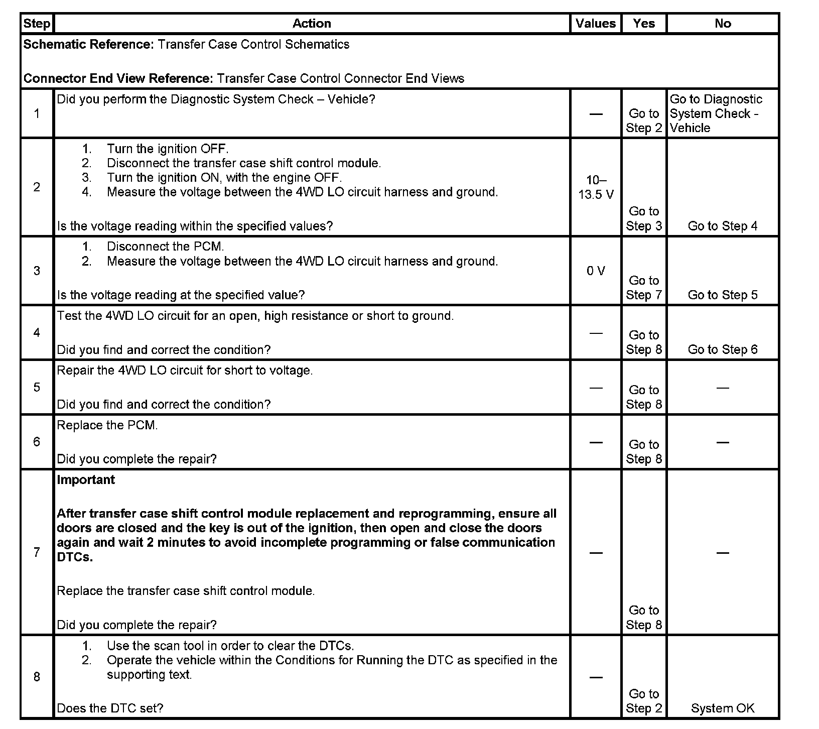^ After the transfer case shift control module grounds the output, the 4WD LO circuit, and reads back a high voltage, the DTC sets. The system does not attempt setting the DTC again for 5 seconds.