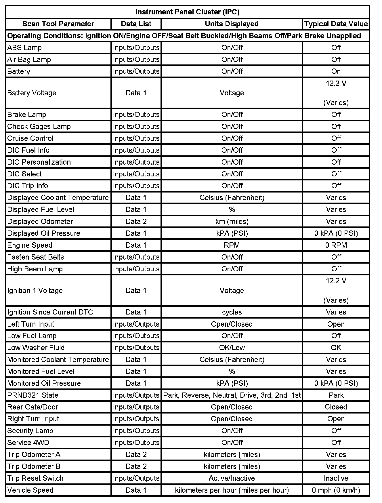 Scan Tool Data List - Instrument Panel Cluster (IPC)