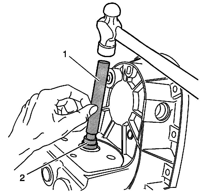3. Using the J 8092 (1) and the J 45239 (2), install the control actuator lever shaft bearing until it bottoms in the bore. The seal side of the bearing faces the encoder motor.