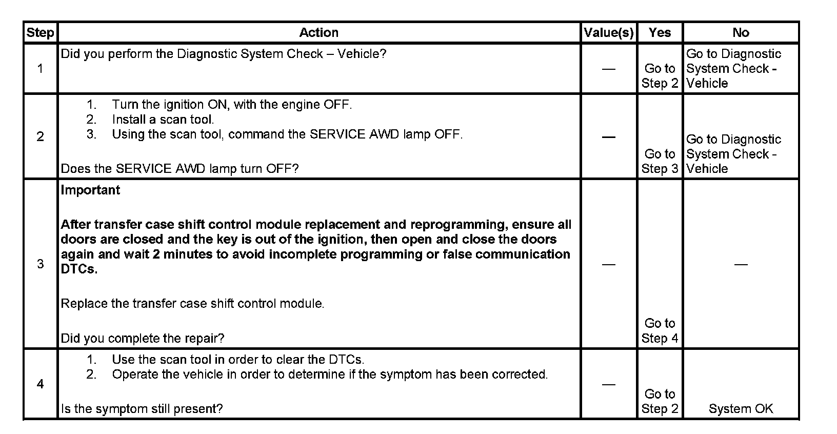 The SERVICE AWD indicator is located in the instrument cluster and shares the instrument cluster common power and ground. The transfer case shift control module controls the SERVICE AWD indicator by sending the instrument cluster a Class 2 message. This lamp may be controlled with the scan tool using the instrument cluster device controls.
