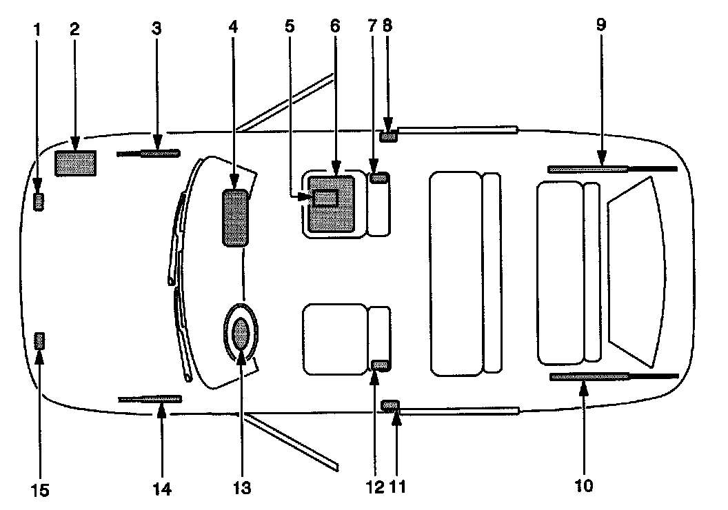 6. Passenger Presences System (PPS) - Located on the passenger front seat underneath the seat bottom trim.
