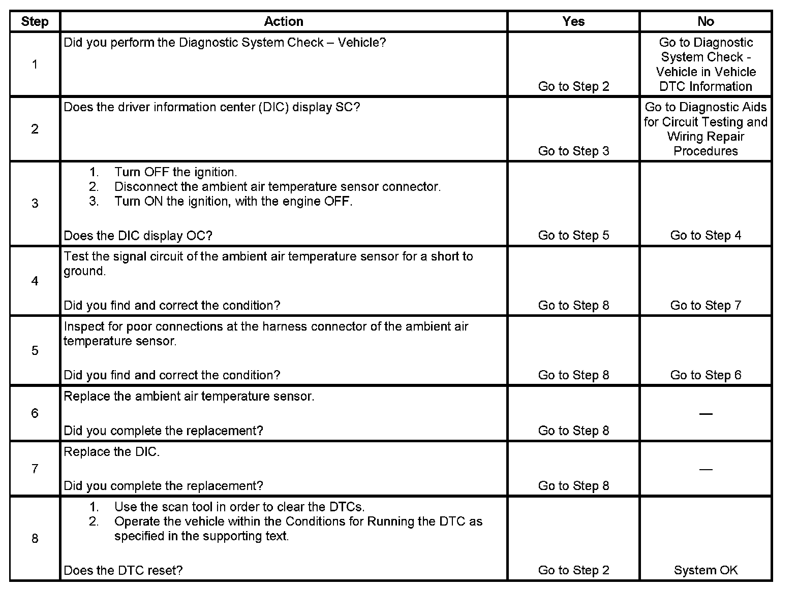 The driver information center (DIC) applies 5 volts to the ambient air temperature sensor. The ambient air temperature sensor is a thermistor which varies in resistance as the temperature changes. As the resistance of the ambient air temperature sensor increases, the DIC senses a larger voltage drop across the sensor, indicating a lower temperature. As the resistance of the ambient air temperature sensor decreases, the DIC senses a smaller voltage drop across the sensor, indicating a higher temperature.