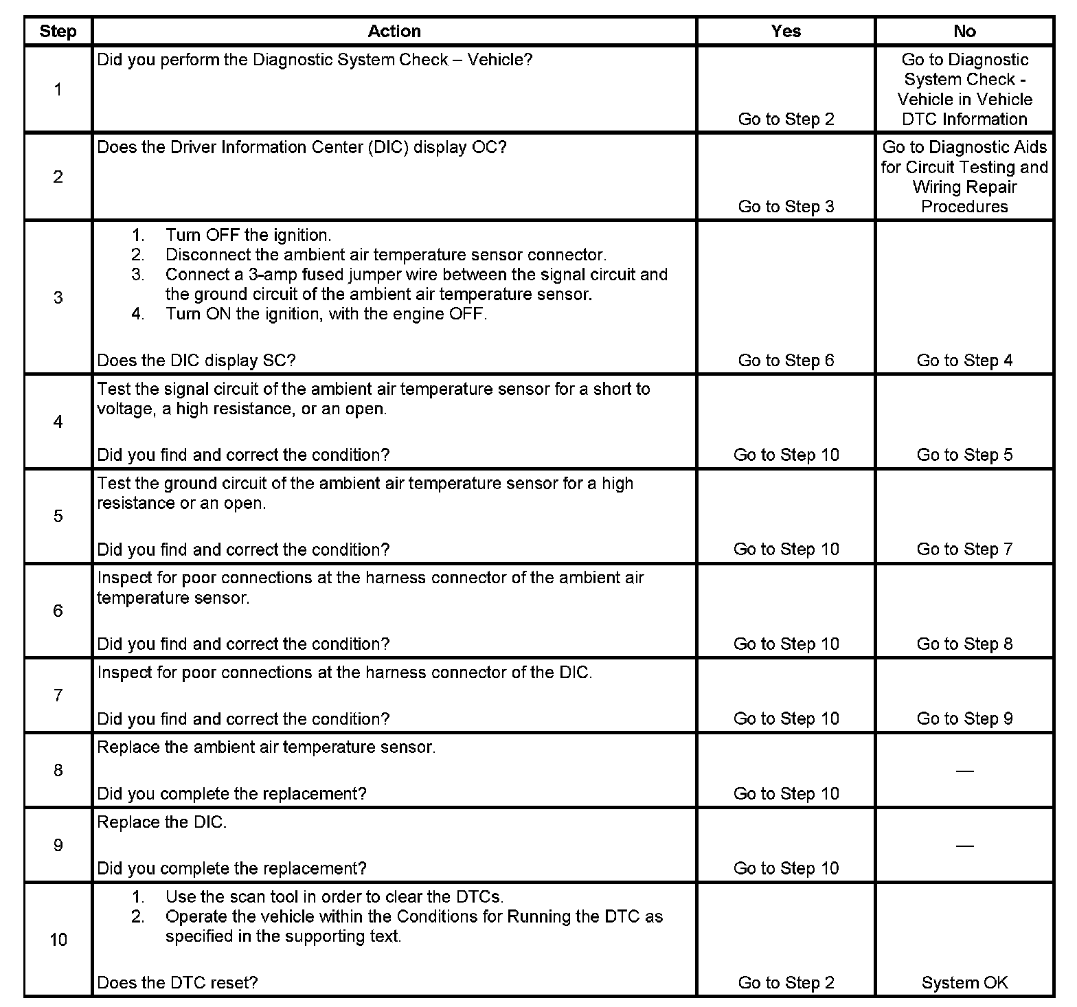 The driver information center (DIC) applies 5 volts to the ambient air temperature sensor. The ambient air temperature sensor is a thermistor which will vary in resistance with temperature change. As the resistance of the ambient air temperature sensor increases, the DIC senses a larger voltage drop across the sensor, indicating a lower temperature. As the resistance of the ambient air temperature sensor decreases, the DIC senses a small voltage drop across the sensor, indicating a higher temperature.