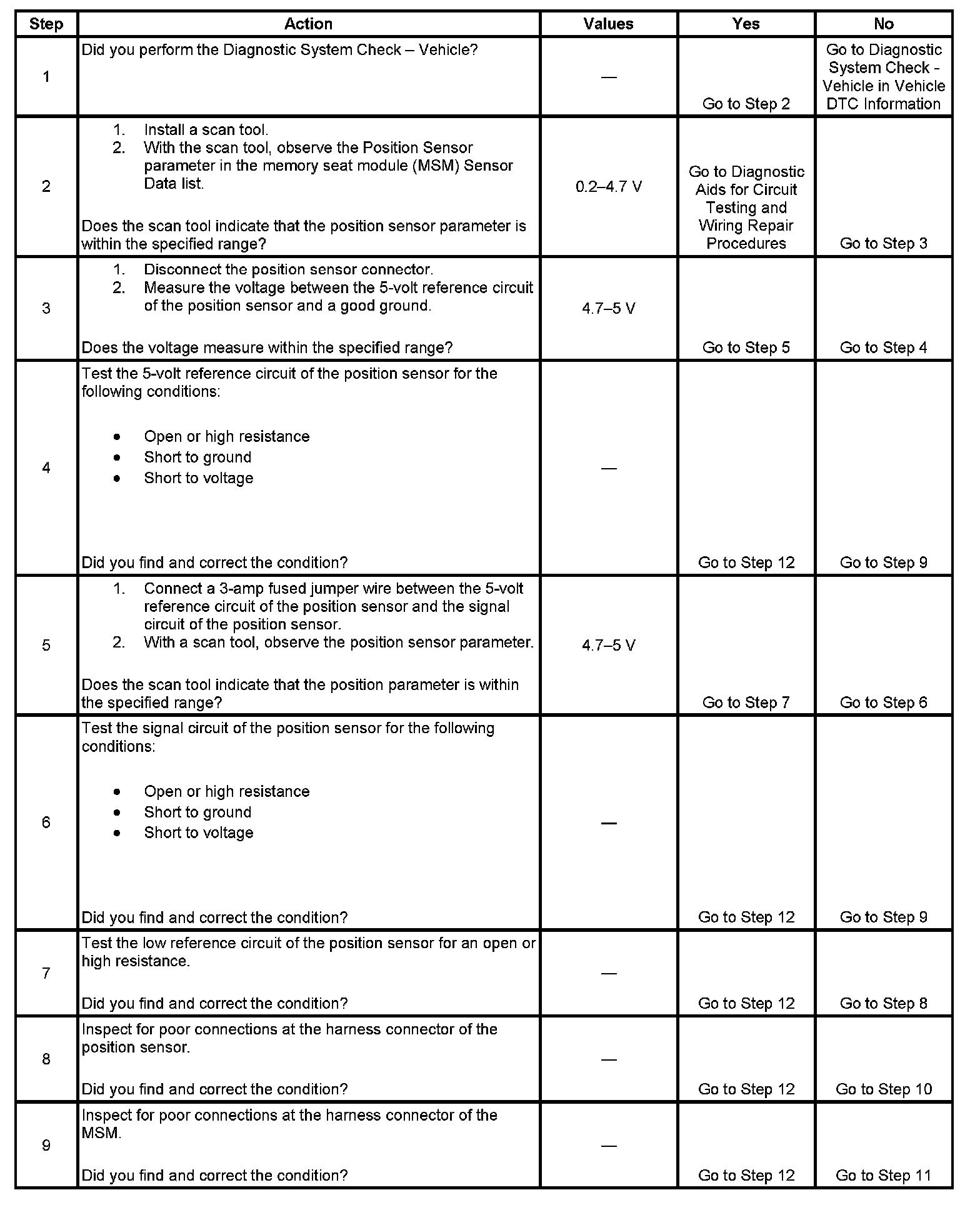 The MSM detects the position sensor signal circuit under 0.24 volts or over 4.75 volts.