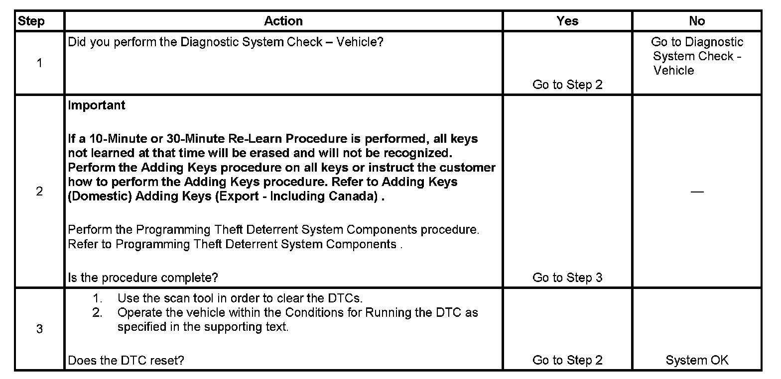 2. To set this code, a key with a working transponder was read by the theft deterrent control module. For that key to operate the vehicle a 10-Minute or 30-Minute Re-Learn Procedure must be performed.