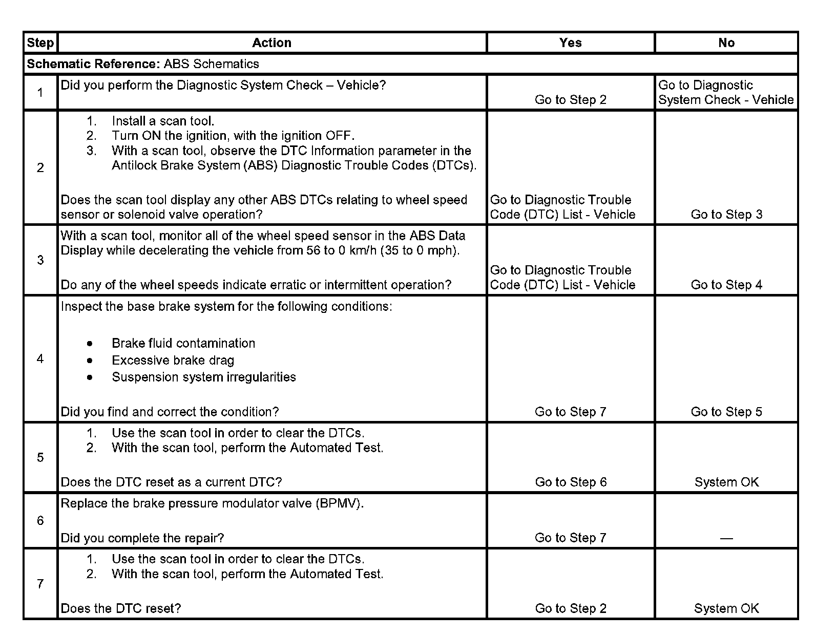 The electronic brake control module (EBCM) monitors the ON/OFF state of each solenoid and recognizes when the ABS is in pressure decrease too long. This fault indicates that the EBCM was unable to decrease brake pressure enough to a certain wheel to prevent excessive wheel slip.