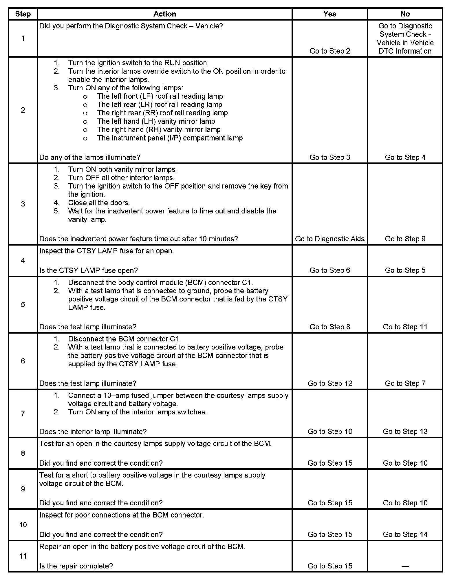- Inspect for an open in the battery positive voltage circuit that feeds the courtesy lamps.