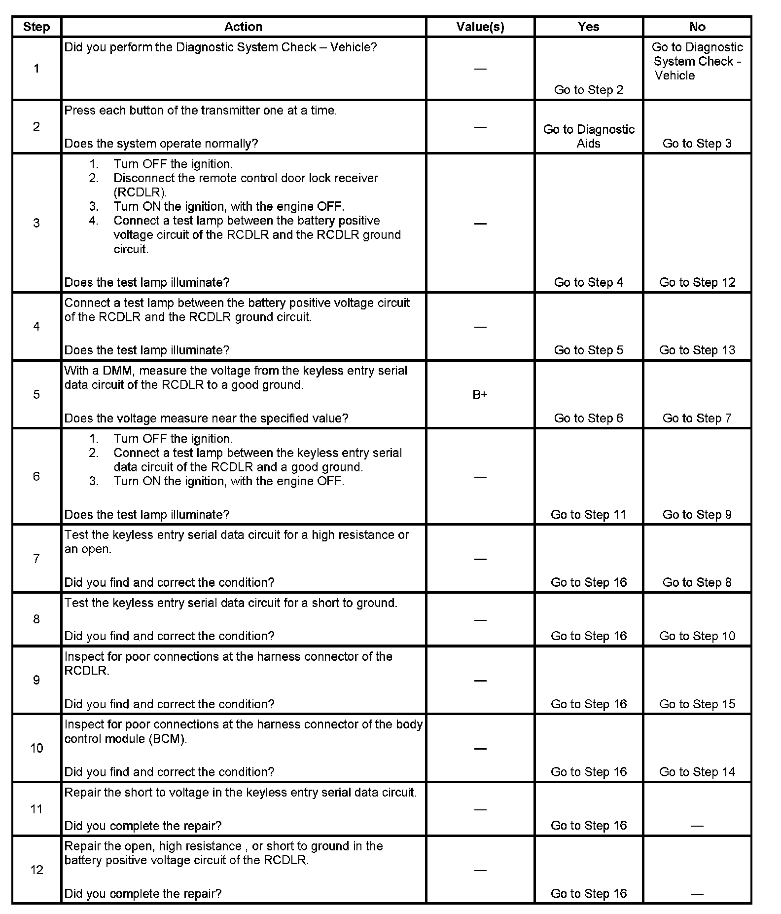 5. Tests for an open, poor connection, or short to ground in the keyless entry serial data circuit. A measurement of B+ indicates good circuit continuity.
