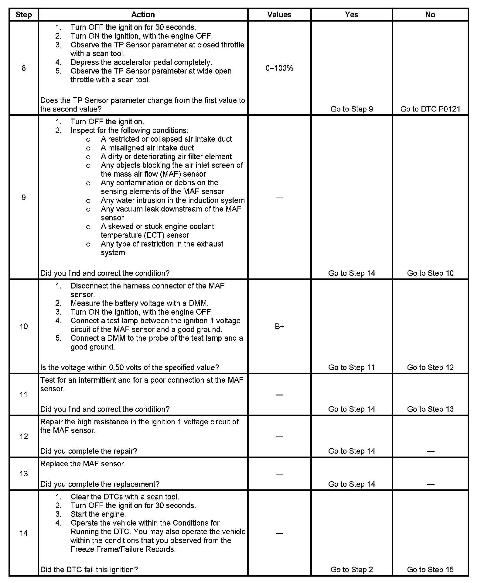 The PCM compares the actual MAF sensor frequency signal to the predicted MAF value. This comparison will determine if the signal is stuck based on a lack of variation, or is too low or too high for a given operating condition. If the PCM detects the actual MAF sensor frequency signal is not within a predetermined range of the calculated MAF value DTC P0101 sets.