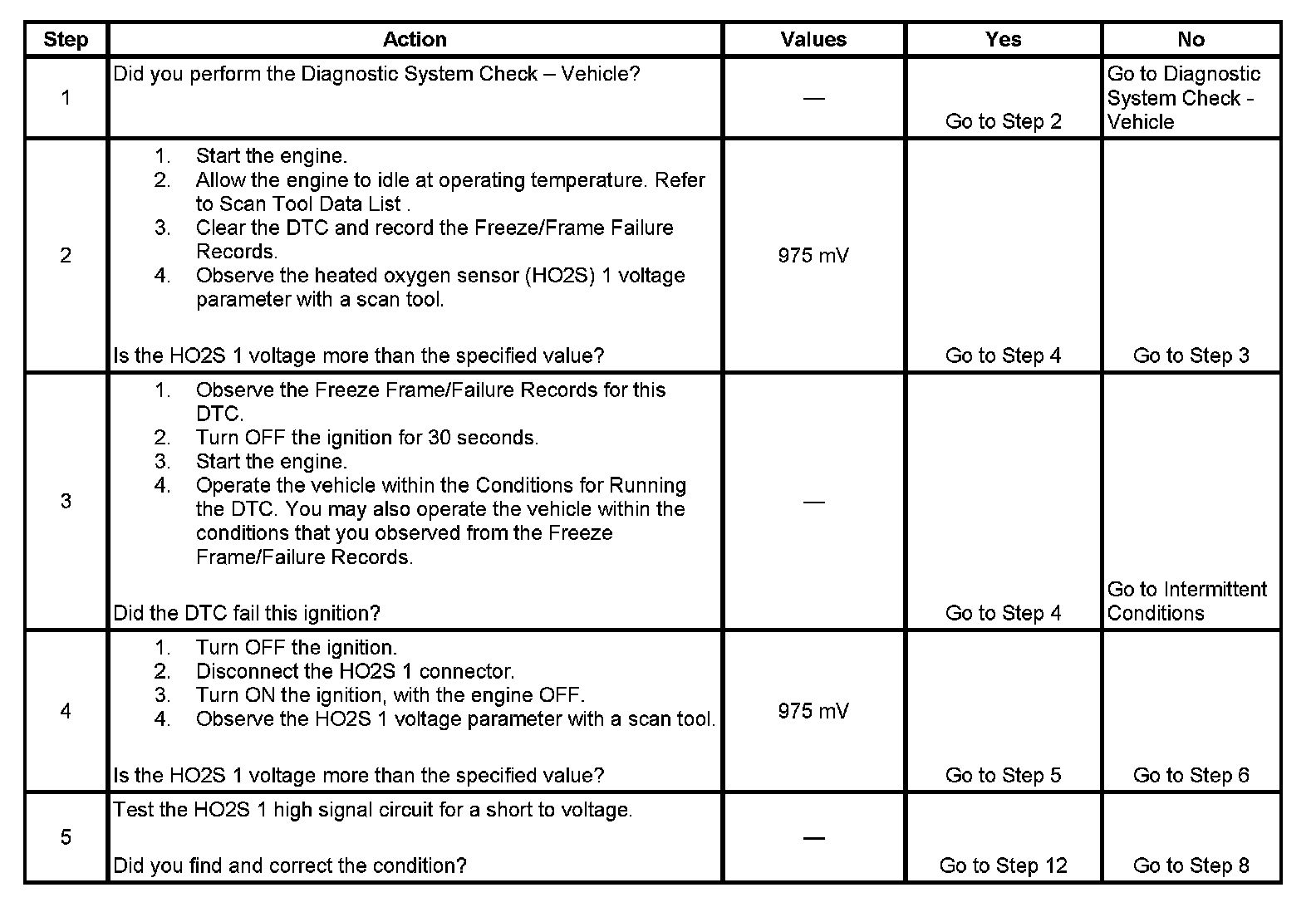If the PCM detects that the HO2S 1 voltage is above a calibrated amount for an excessive amount of time, DTC P0132 will set.