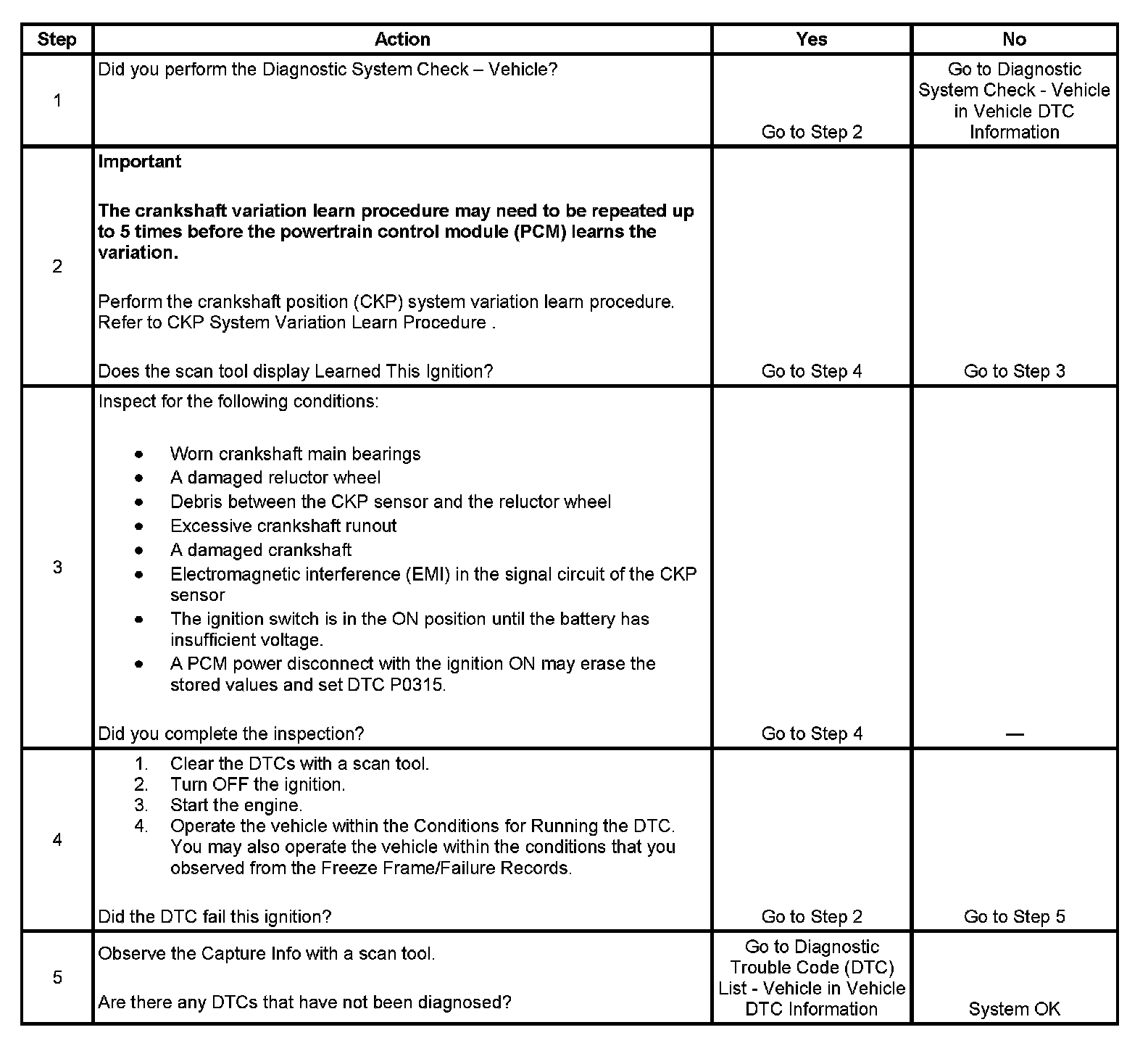 The PCM stores the CKP system variation values after a learn procedure has been performed. If the actual CKP variation is not within CKP system variation compensating values stored in the PCM, or if the CKP system variation values are not stored in the PCM memory, DTC P0315 sets.