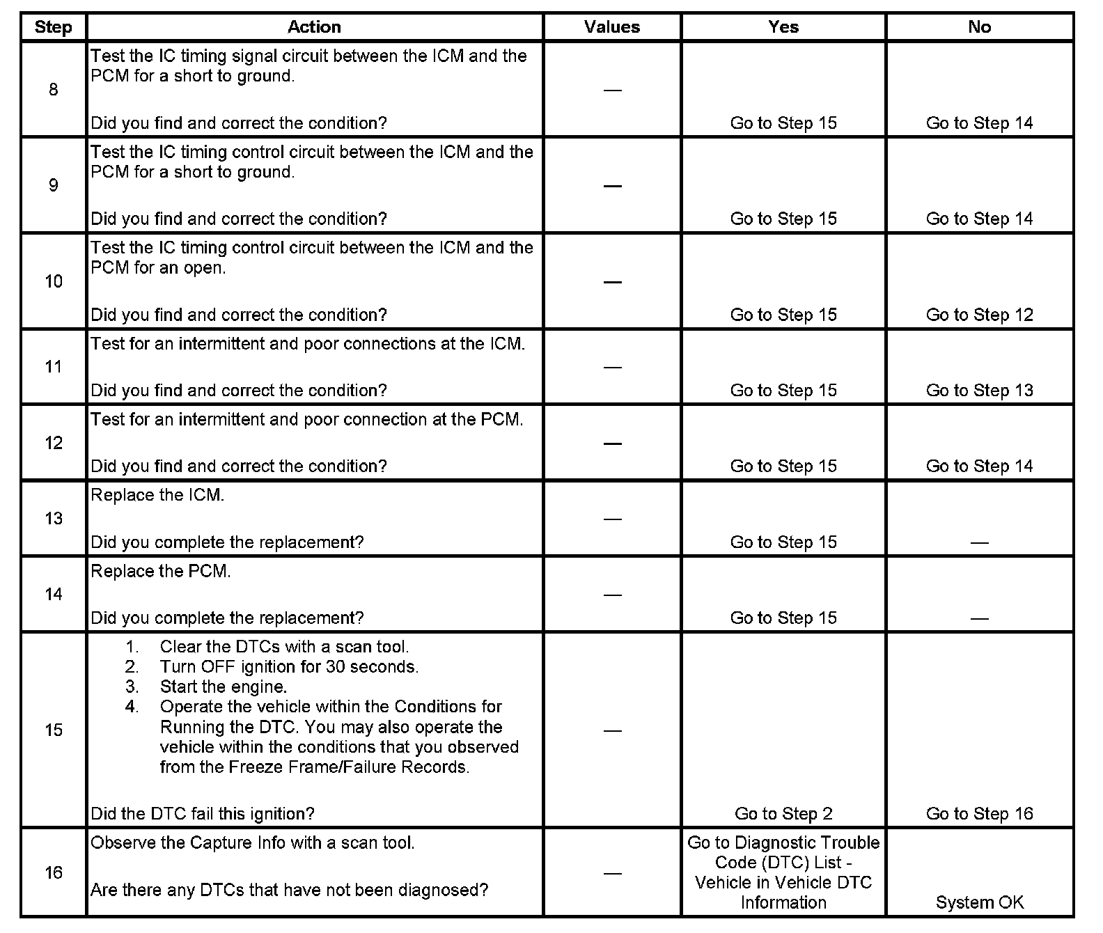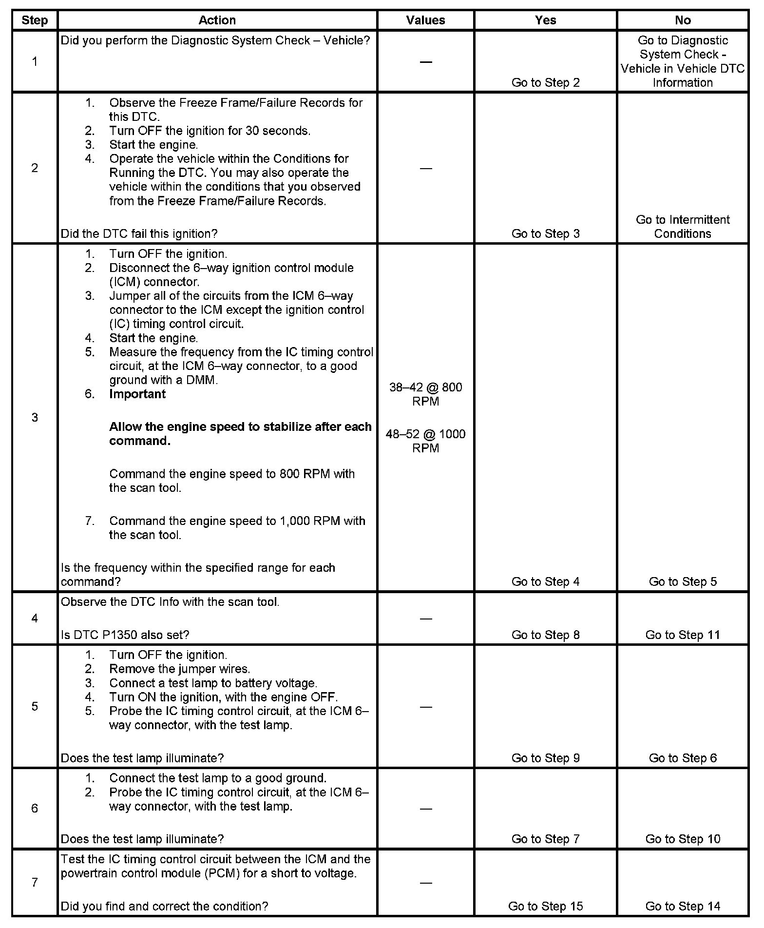 The PCM sends spark timing signals to the ICM on the IC timing control circuit, but during cranking, the ICM grounds these signals. When the PCM begins receiving the 3X reference pulses from the ICM and the engine starts, the PCM applies 5 volts to the IC timing signal circuit allowing the ICM to switch to the IC mode of operation and respond to the spark timing signals from the PCM. The PCM monitors the IC timing control circuit for errors. If the PCM detects a fault, DTC P0350 sets.