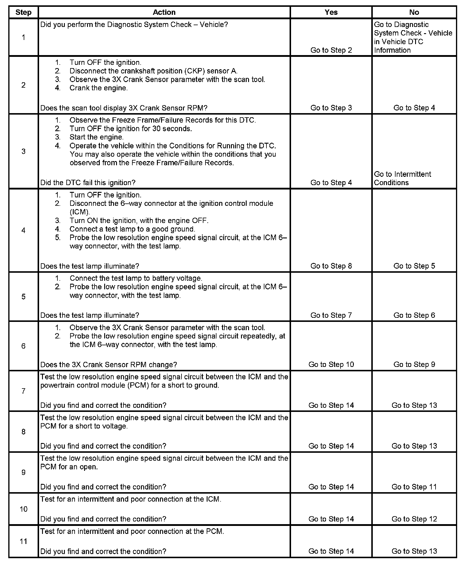 The crankshaft position (CKP) sensor B is a 7X variable reluctance sensor. This produces 7 digital ON/OFF pulses per engine revolution. These pulses occur when a reluctor wheel, mounted to the crankshaft and containing 6 slots evenly spaced 60 degrees apart and 1 slot spaced at 10 degrees, passes by the sensor. The 7X sensor is connected directly to the ignition control module (ICM). The sensor wiring includes 2 circuits, a CKP sensor signal circuit and a low reference circuit. The ICM uses the 7X signal to determine the engine position and speed. A signal converter within the ICM produces a digital 3X output pulse to the powertrain control module (PCM) on the low resolution engine speed signal circuit. The PCM monitors the low resolution engine speed signal circuit for errors. If the PCM receives no signal from the ICM, DTC P0385 sets.