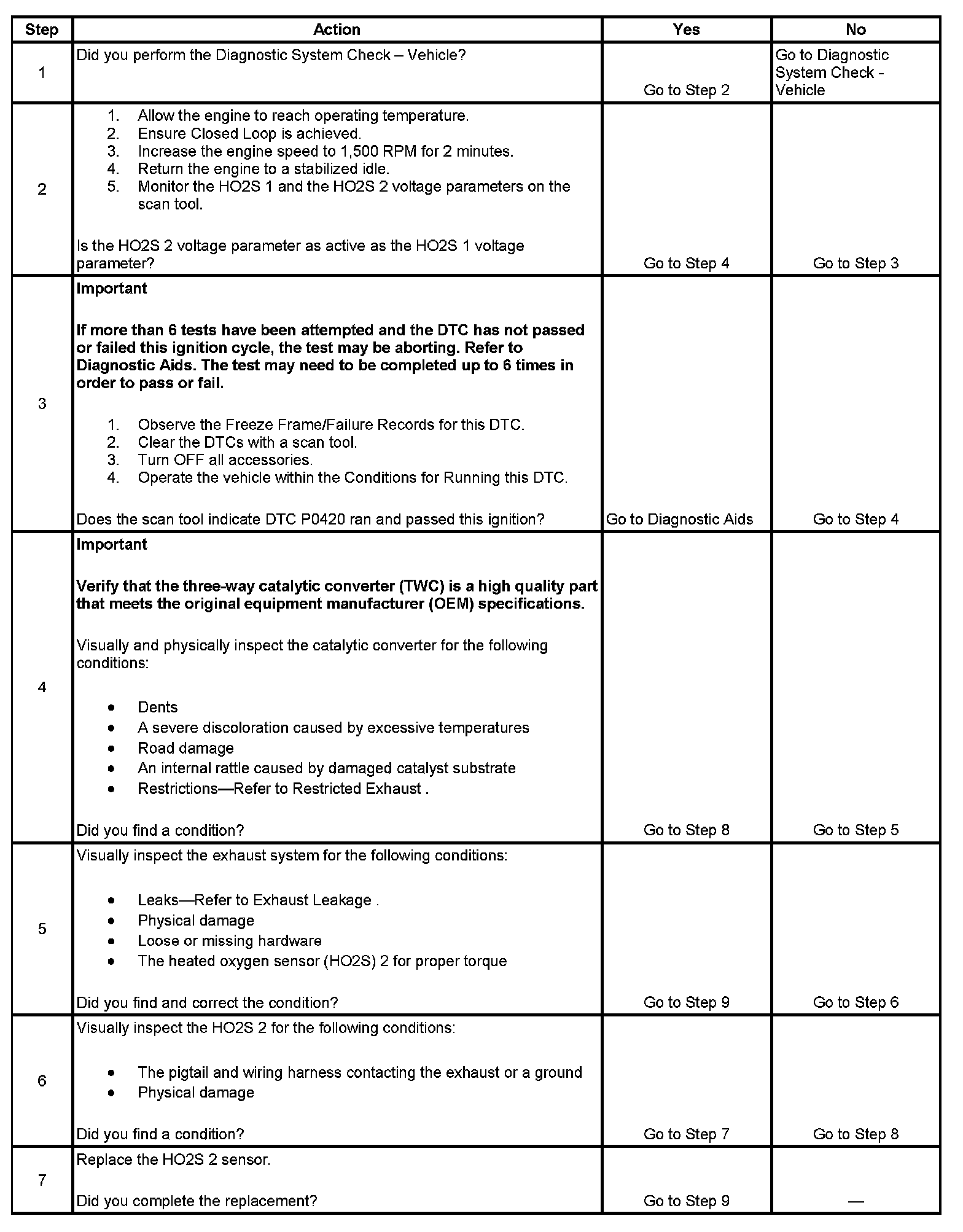 A three-way catalytic converter (TWC) controls emissions of hydrocarbons (HC), carbon monoxide (CO), and oxides of nitrogen (NOx). The catalyst within the converter promotes a chemical reaction which oxidizes the HC and the CO that are present in the exhaust gas. This process converts the HC and the CO into water vapor and carbon dioxide (CO2), and reduces the NOx, converting the NOx into nitrogen. The catalytic converter also stores oxygen. The powertrain control module (PCM) monitors this process by using a heated oxygen sensor (HO2S) that is in the exhaust stream after the TWC. This HO2S 2, also referred to as the catalyst monitor sensor, produces an output signal that the PCM uses to calculate the oxygen storage capacity of the catalyst. This indicates the ability of the catalyst to convert the exhaust emissions efficiently. The PCM monitors the efficiency of the catalyst by allowing the catalyst to heat, then wait for a stabilization period while the engine is idling. The PCM then adds and removes fuel while monitoring the HO2S 2. When the catalyst is functioning properly, the HO2S 2 response to the extra fuel is slow compared to the response of the HO2S 1, which is located before the TWC. When the HO2S 2 response is near that of the HO2S 1, the oxygen storage capability and efficiency of the catalyst may be degraded below an acceptable threshold. If the PCM detects the degraded condition, DTC P0420 sets.
