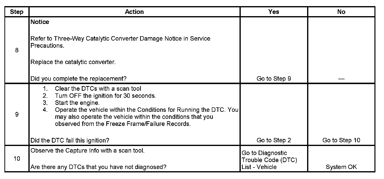 The PCM determines that the efficiency of the catalyst has degraded below a calibrated threshold. This diagnostic may conclude in as few as one test attempt. However, this diagnostic may require as many as 18 test attempts, which would require at least 3 drive cycles. Each test attempt concludes within 2 minutes.