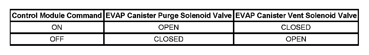 The table illustrates the relationship between the ON and OFF states, and the OPEN or CLOSED states of the EVAP canister purge and vent solenoid valves.