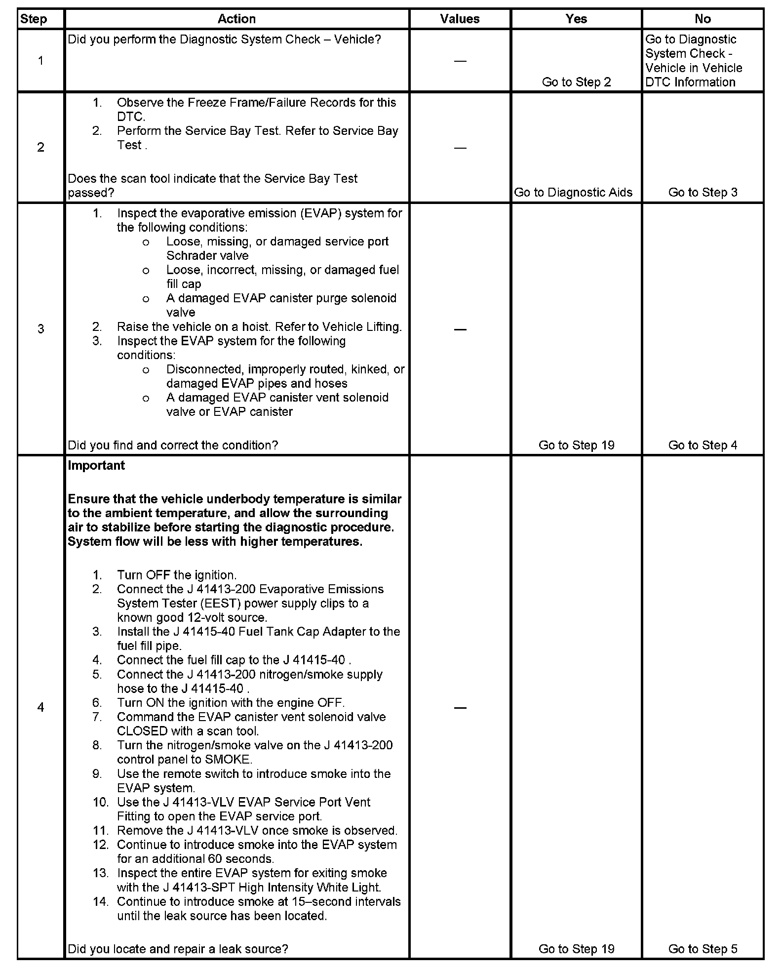 The numbers below refer to the step numbers on the diagnostic table.