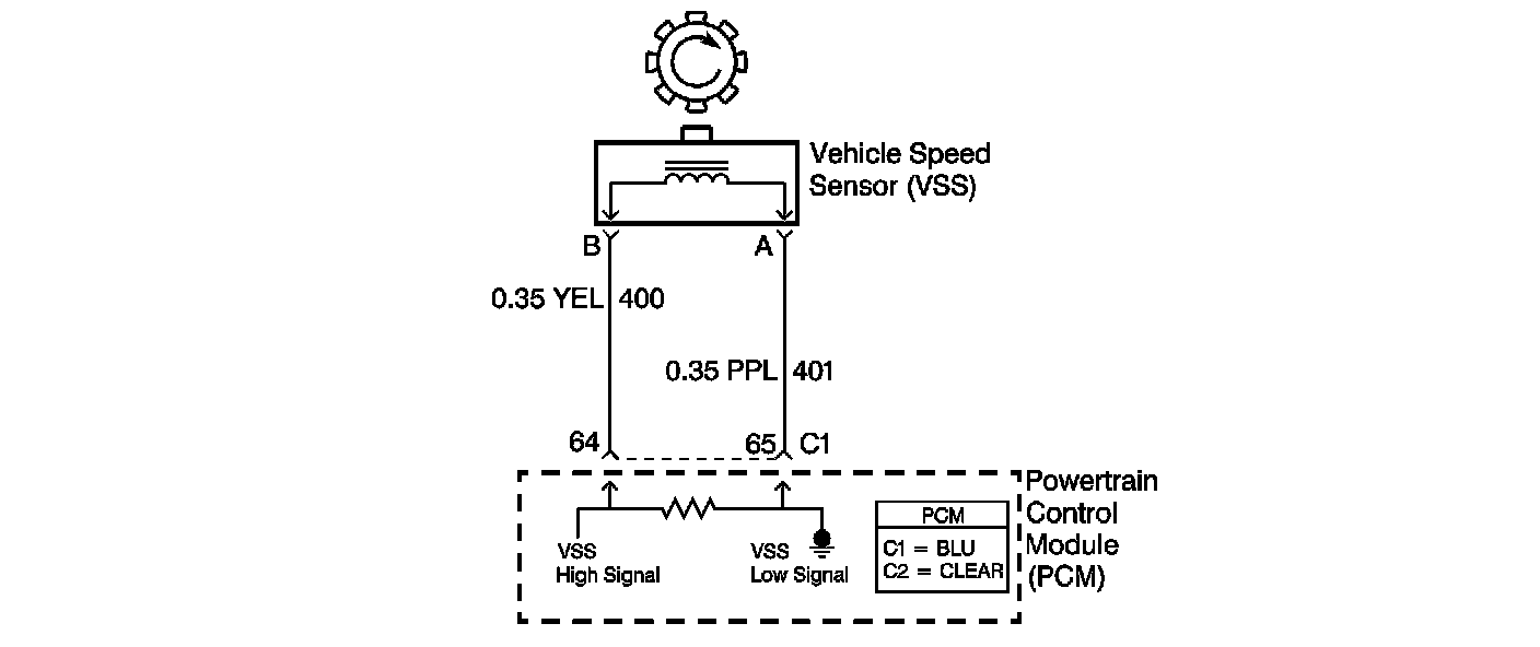 The vehicle speed sensor (VSS) system is a pulse generator consisting of a speed sensor assembly, located in the case extension, and a toothed vehicle speed sensor reluctor wheel, which is pressed onto the final drive carrier assembly. As the vehicle drives forward, the vehicle speed sensor reluctor wheel rotates. This rotation produces a variable AC signal in the pickup coil that is proportional to vehicle speed. The powertrain control module (PCM) uses this signal in order to calculate vehicle speed, shift timing and gear ratios.