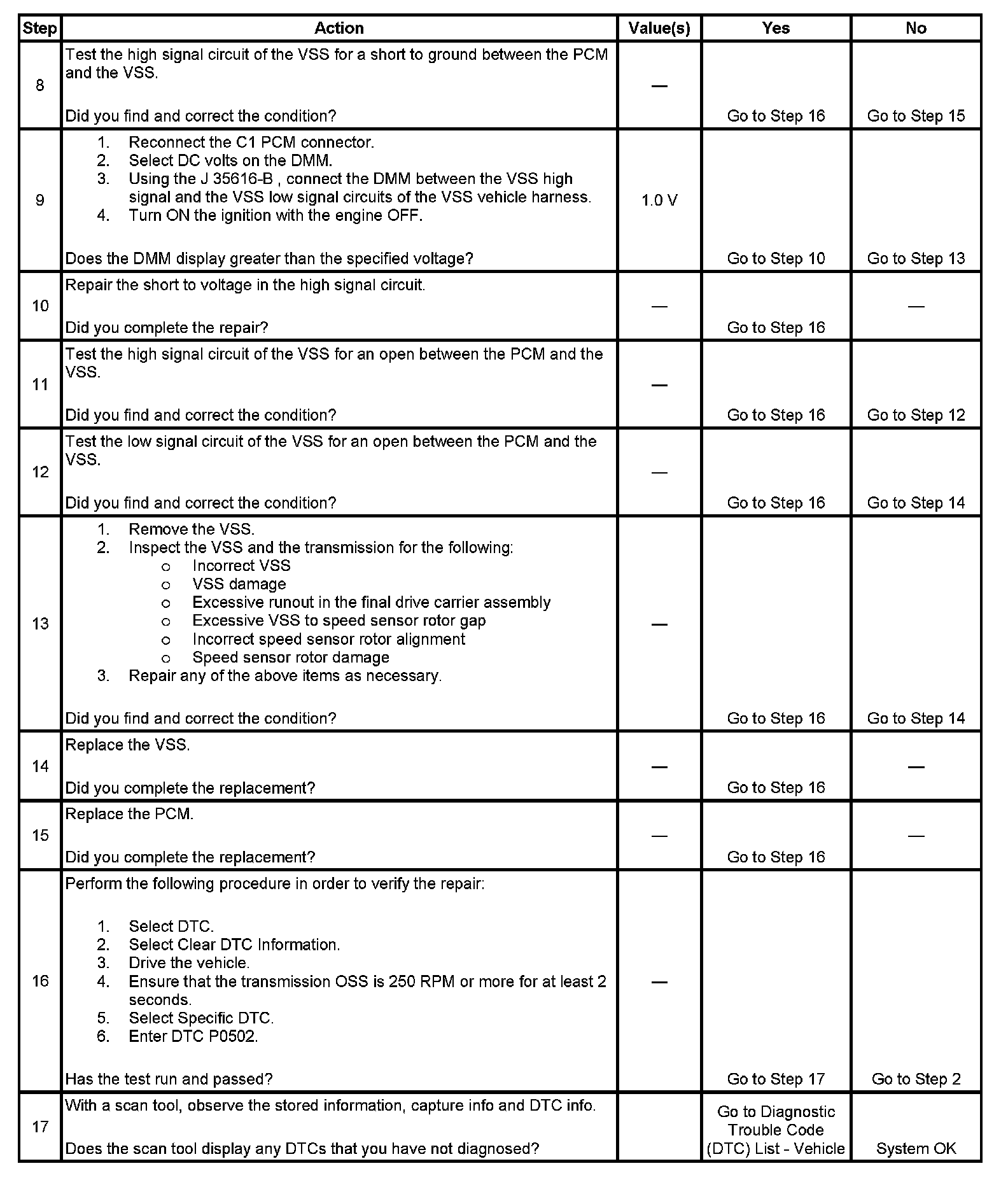 If the PCM detects a low vehicle speed with a high engine speed while in a drive range, then DTC P0502 sets. DTC P0502 is a type B DTC.