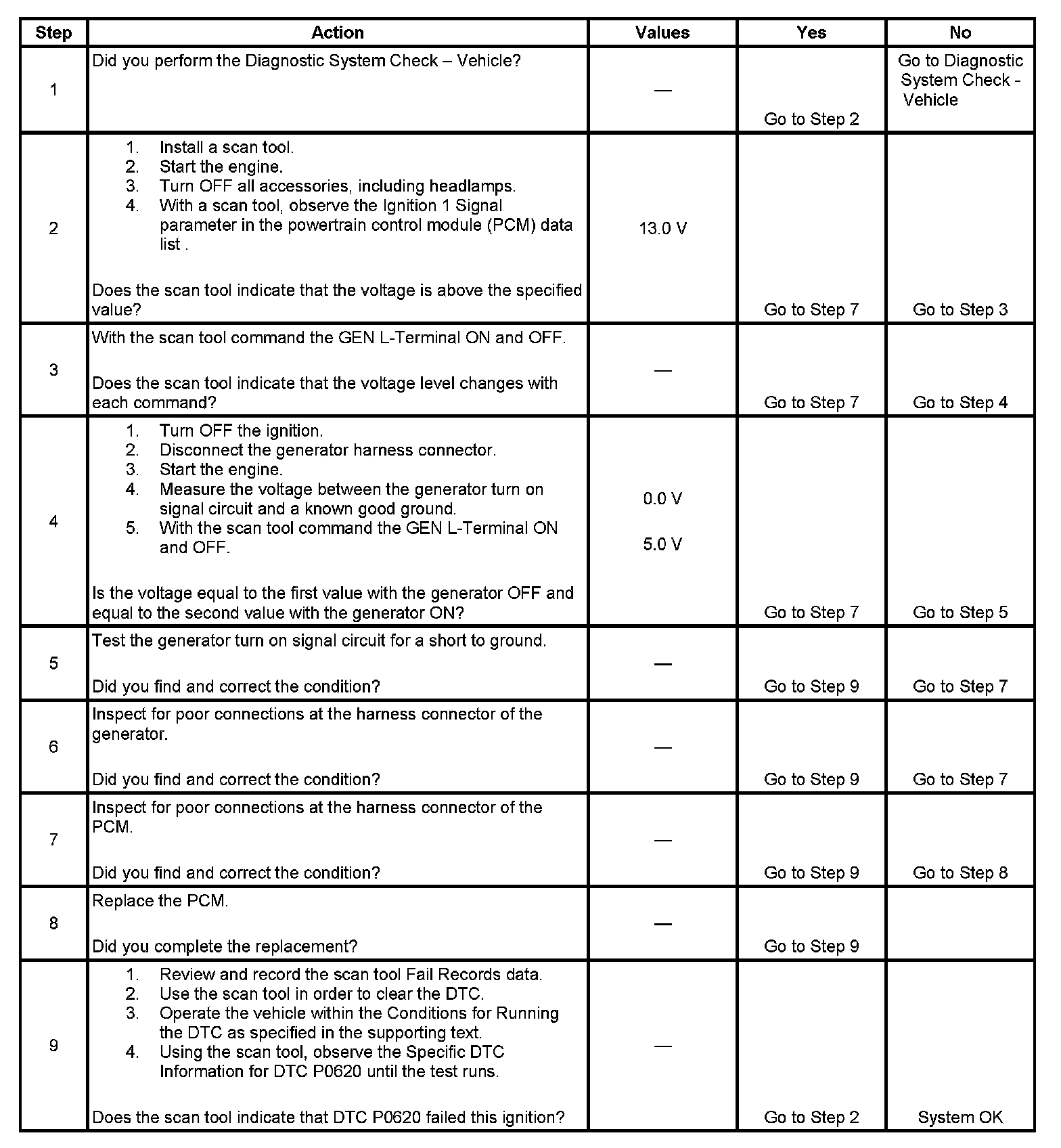 - The generator turn on signal circuit voltage is low while the PCM is commanding the generator on.