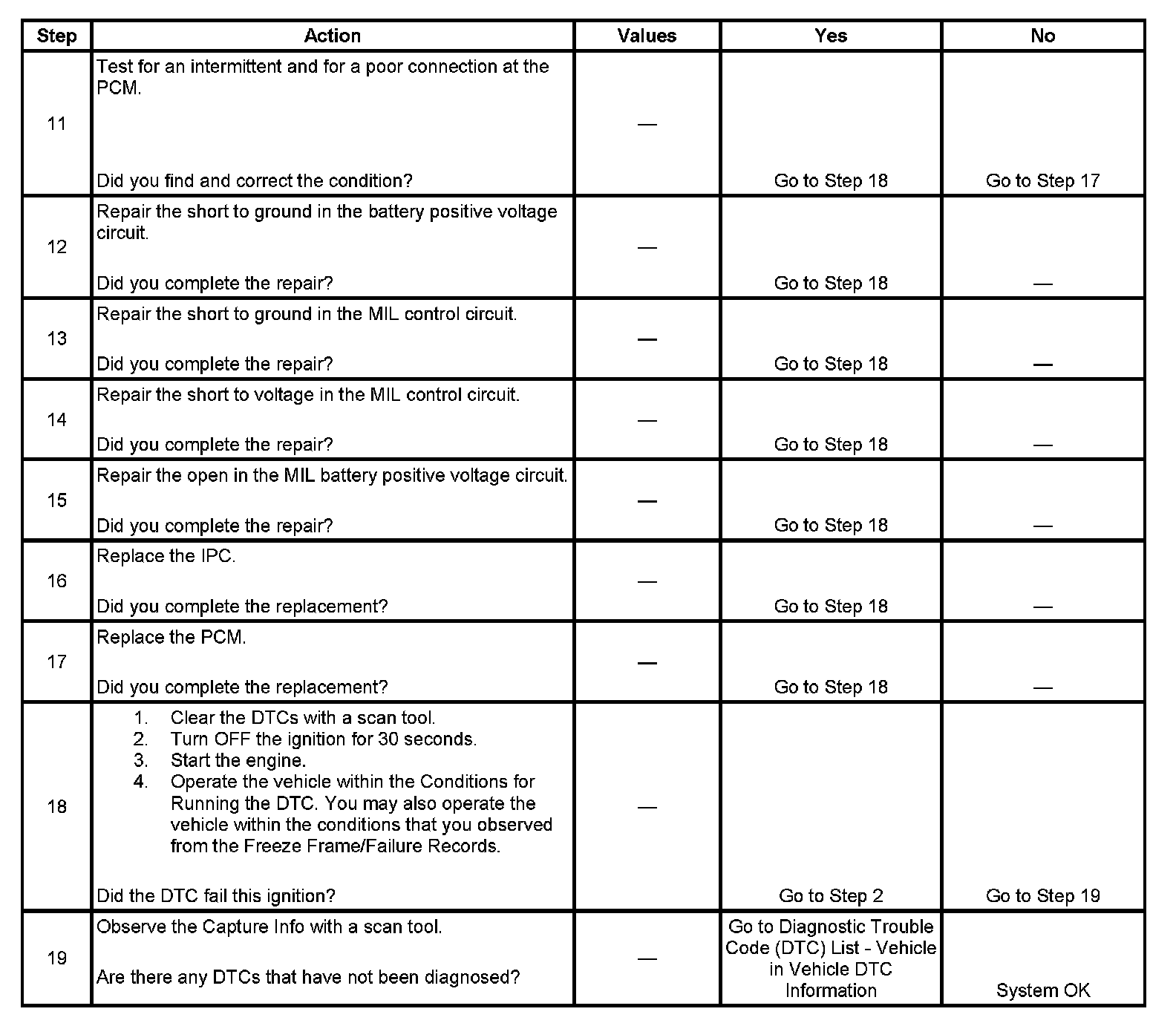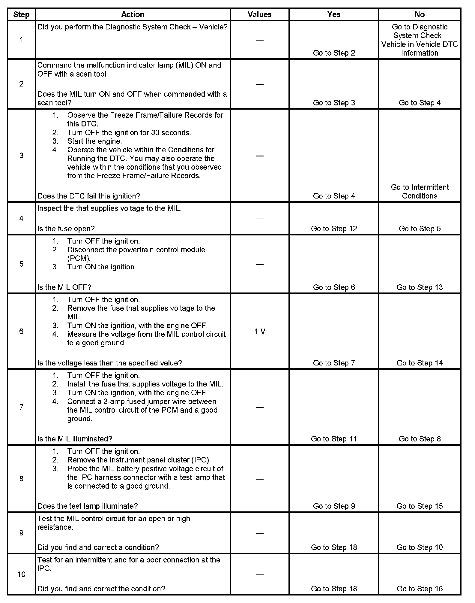5. This step tests for a short to ground in the MIL control circuit. With the PCM disconnected and the ignition ON, the MIL should be OFF.
