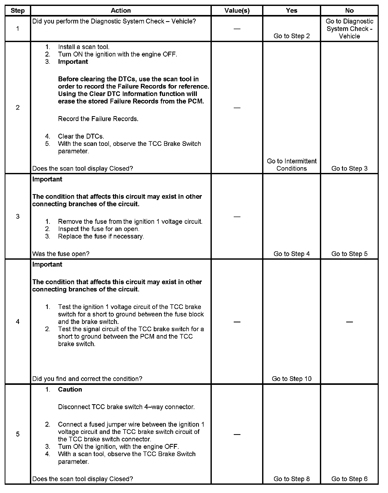 5. This step isolates the fault between the TCC brake switch and the harness.