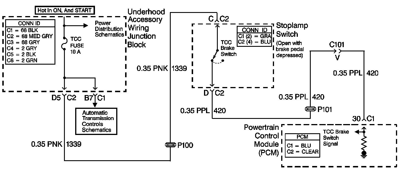 The torque converter clutch (TCC) brake switch indicates brake pedal status to the powertrain control module (PCM). The TCC brake switch indicates that the brake pedal is either applied or released. The normally-closed switch supplies battery voltage to the PCM. Applying the brake pedal opens the TCC brake switch, interrupting voltage to the PCM. When the PCM receives 0 volts at the TCC brake switch input, the PCM turns OFF the torque converter clutch pulse width modulation (TCC PWM) solenoid valve.