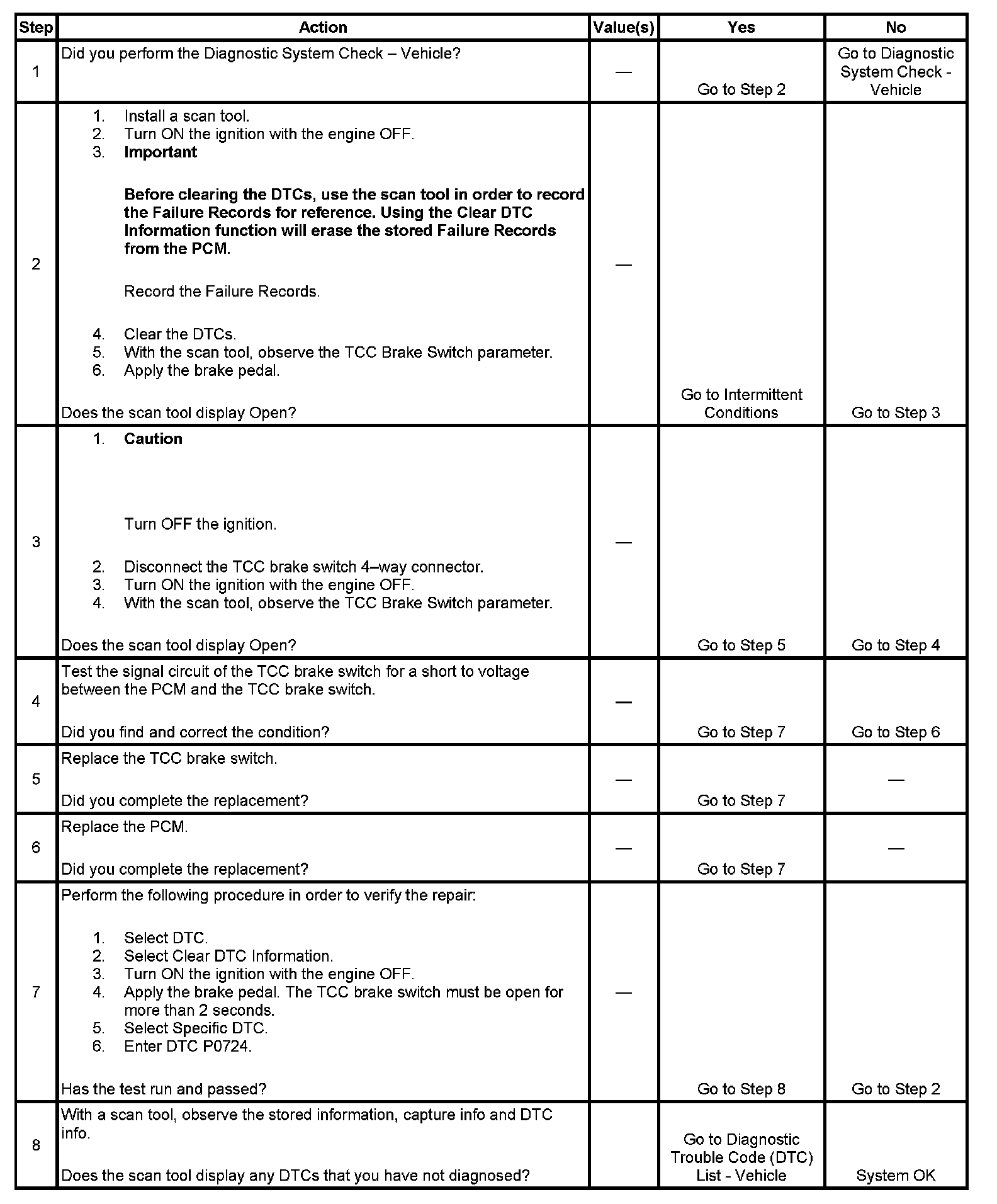 If the PCM detects a closed TCC brake switch, indicating pedal released, during a number of decelerations, then DTC P0724 sets. DTC P0724 is a type C DTC.