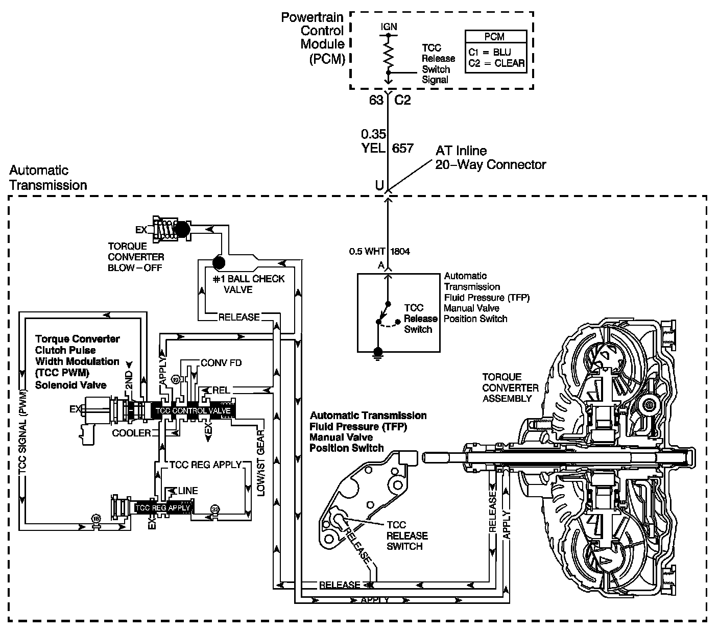 The TCC release switch is a normally-closed switch. When the TCC is released, TCC release fluid pressure opens the TCC release switch which opens the TCC release pressure circuit. When the voltage on the circuit is high, switch open, the powertrain control module (PCM) recognizes that the TCC is no longer engaged.