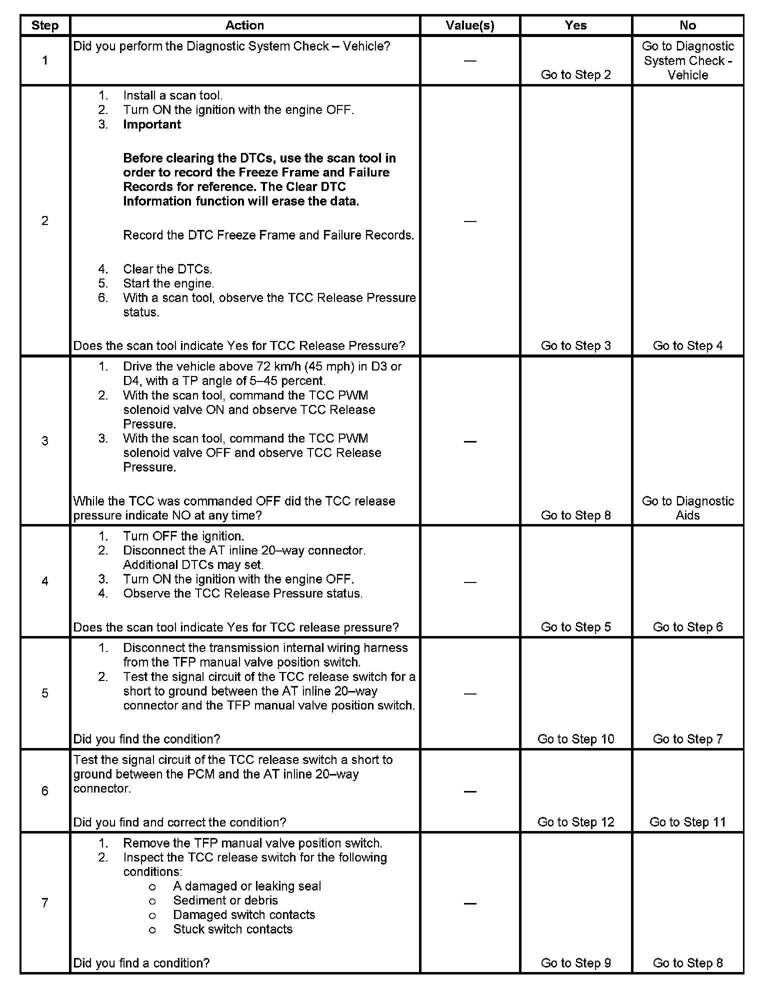 ^ If the scan tool indicated TCC release pressure was present in Step 2 and a mechanical or hydraulic condition was not found in Step 8, an intermittent short to ground condition may exist in the TCC release switch signal circuit.