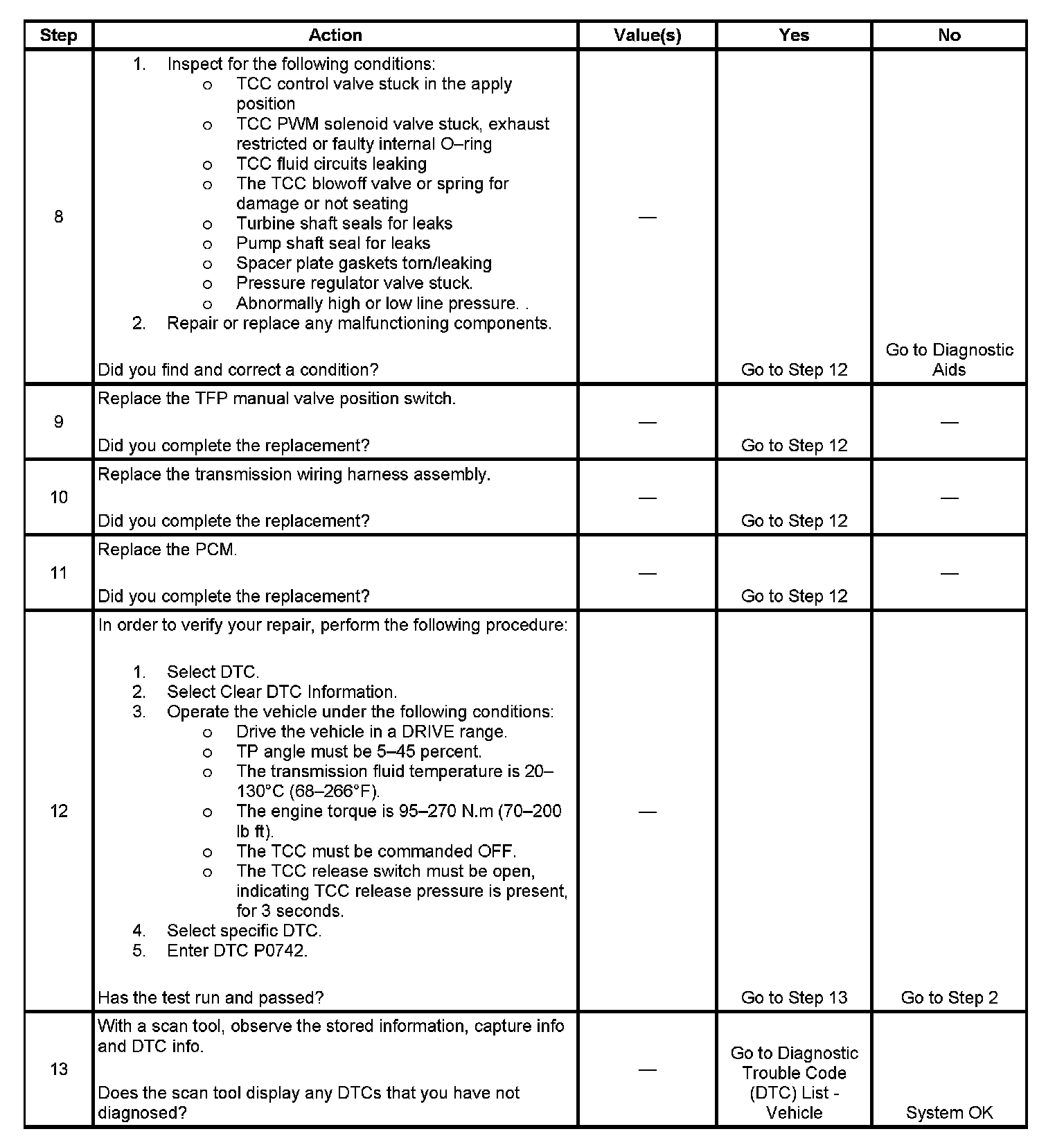 If the PCM detects that the TCC release switch is closed when the TCC is commanded OFF, then DTC P0742 sets. DTC P0742 is a type B DTC.