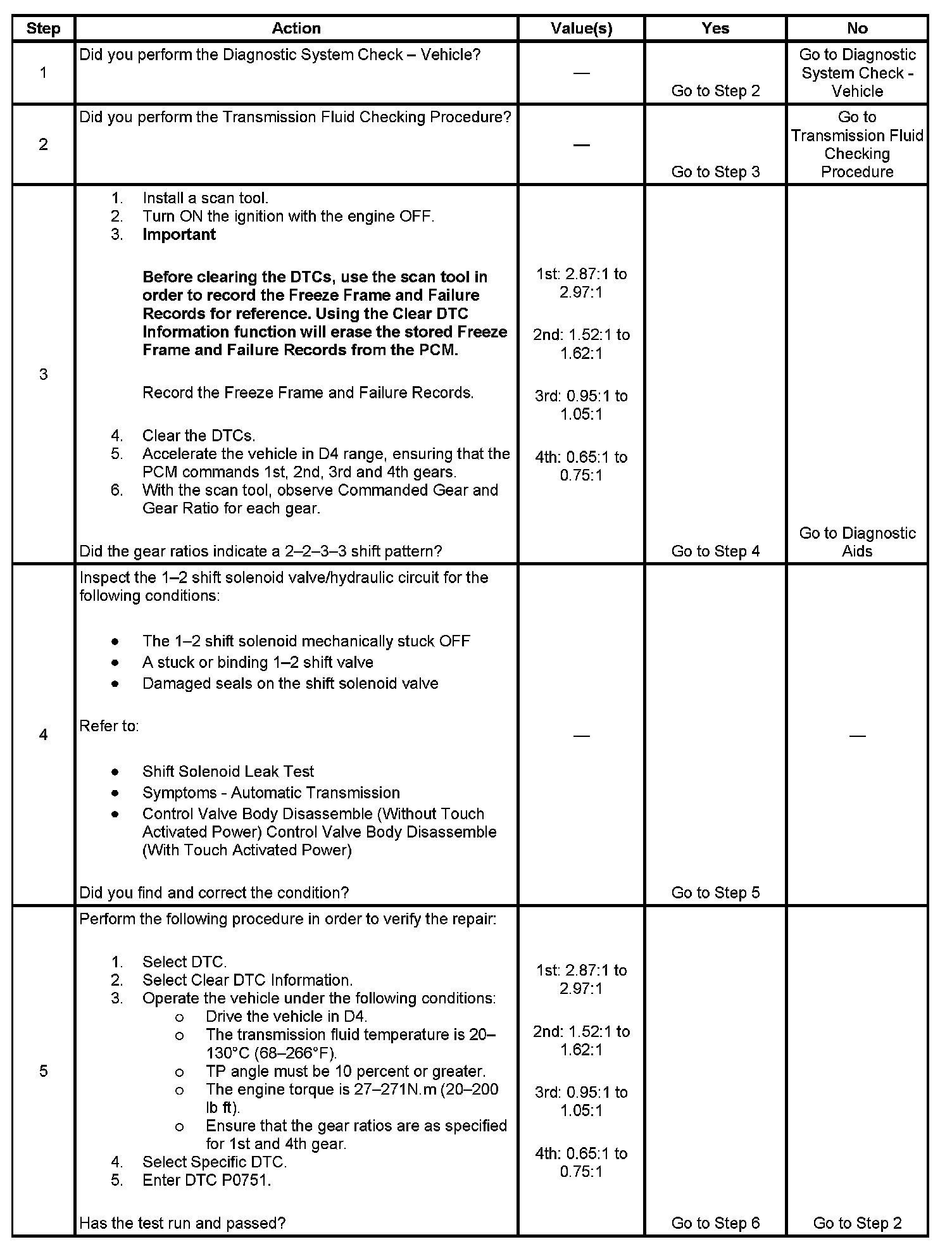 If the PCM detects a 2nd gear ratio when 1st gear is commanded and a 3rd gear ratio when 4th gear is commanded, then DTC P0751 sets. DTC P0751 is a type B DTC.