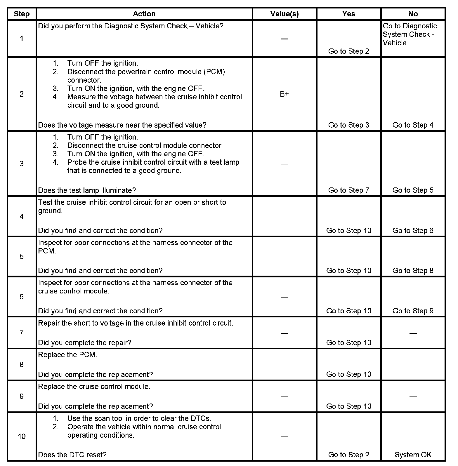 - The PCM detects an improper voltage level on the output circuit that controls the cruise inhibit control circuit.