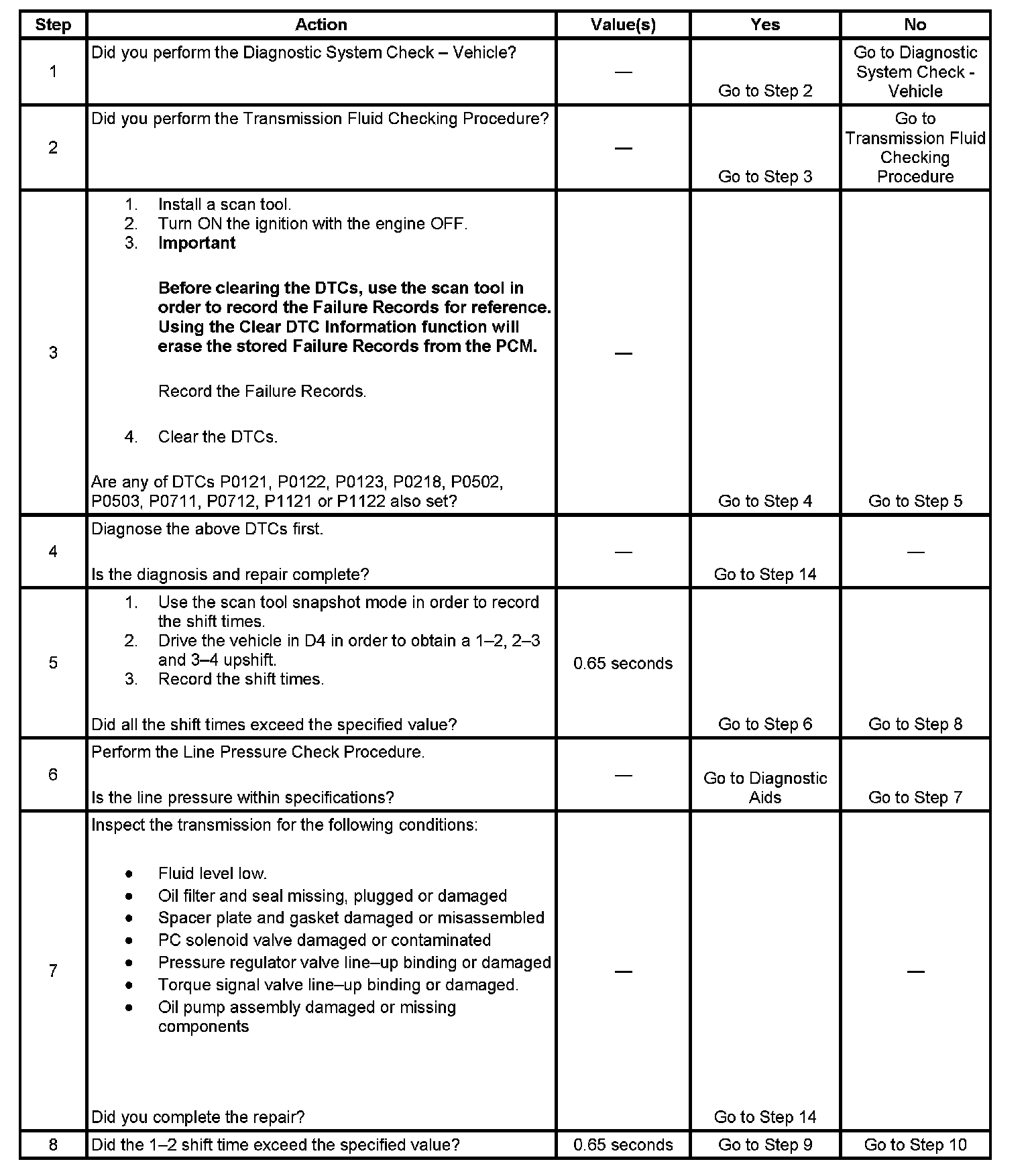 The transmission pressure is modified by an adaptive modifier which controls the shift execution time. This diagnostic tests the time required to accomplish the shift. If the shift takes longer than 0.65 seconds and the adaptive modifier cannot shorten this time, then a counter increases by one.
