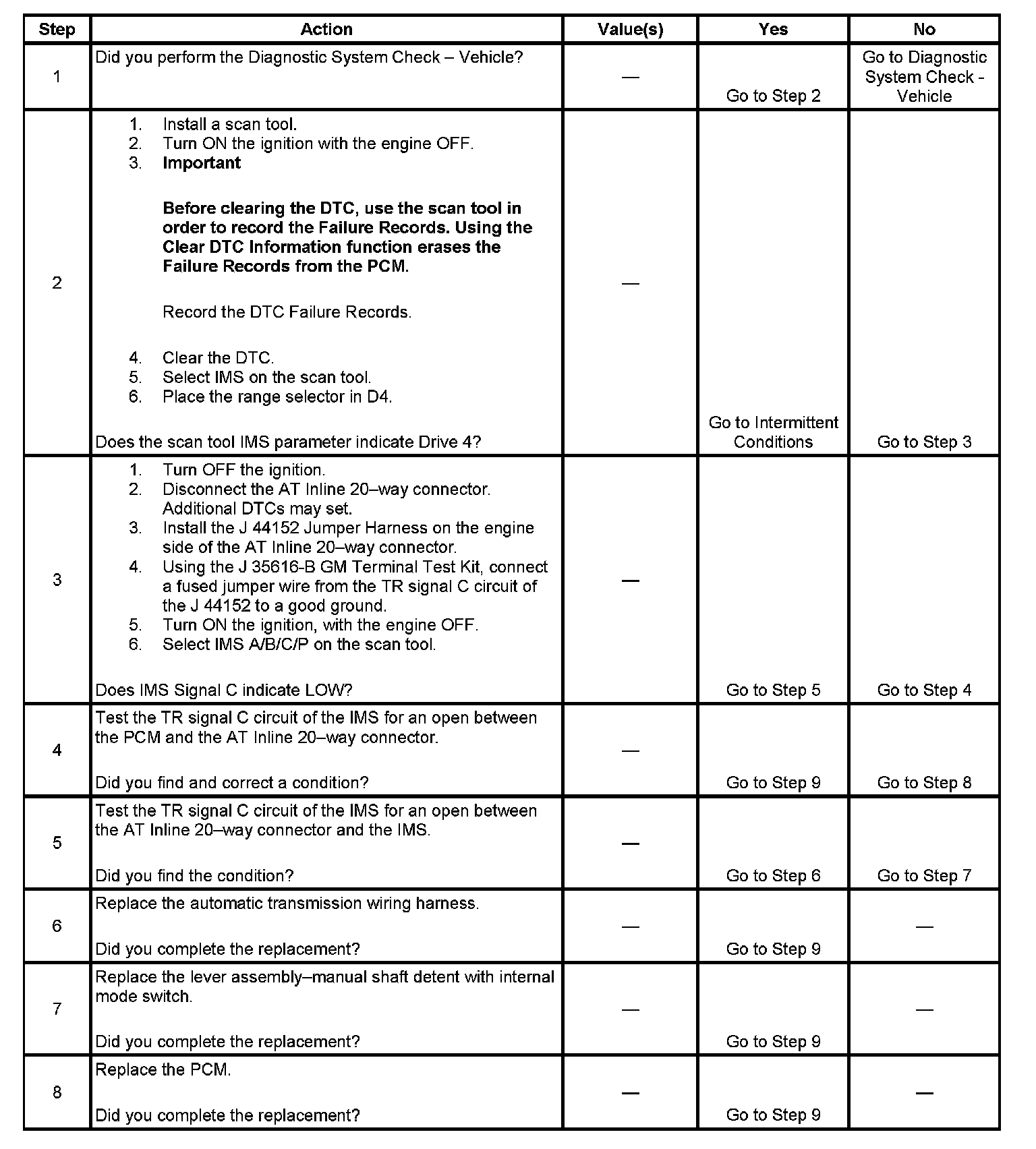 3. This step tests the integrity of the engine harness and PCM by checking for the Signal C state change from HI to LOW. A LOW signal indicates the fault is either in the internal transmission harness or the switch. A HI signal indicates the fault is either in the engine harness or the PCM.