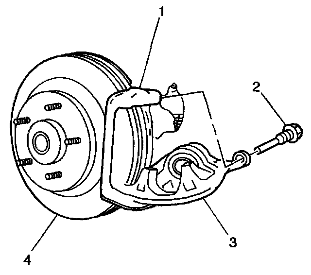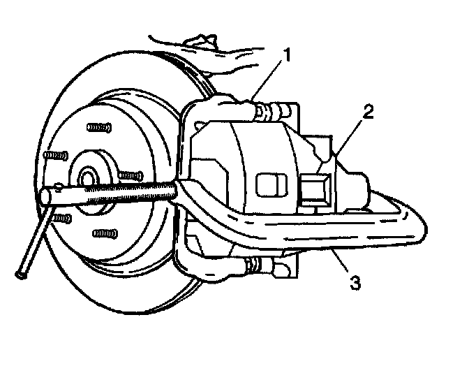 4. Swing the caliper (3) upward in position around the pads support using a heavy gage wire.