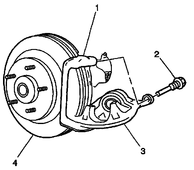 10. Rotate the brake caliper (3) down in order to access the brake pads. Do not remove the brake caliper from the brake caliper bracket (1).
