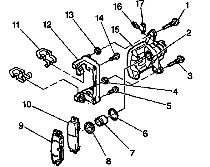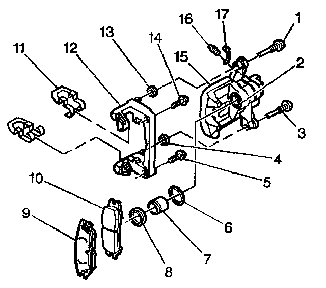 11. Remove the brake pads (9 and 10) from the caliper bracket (12).